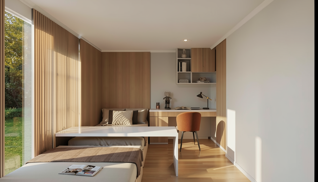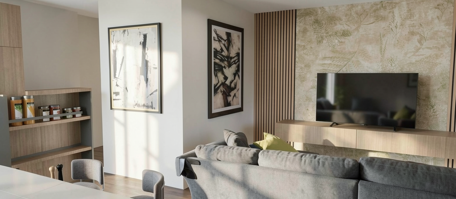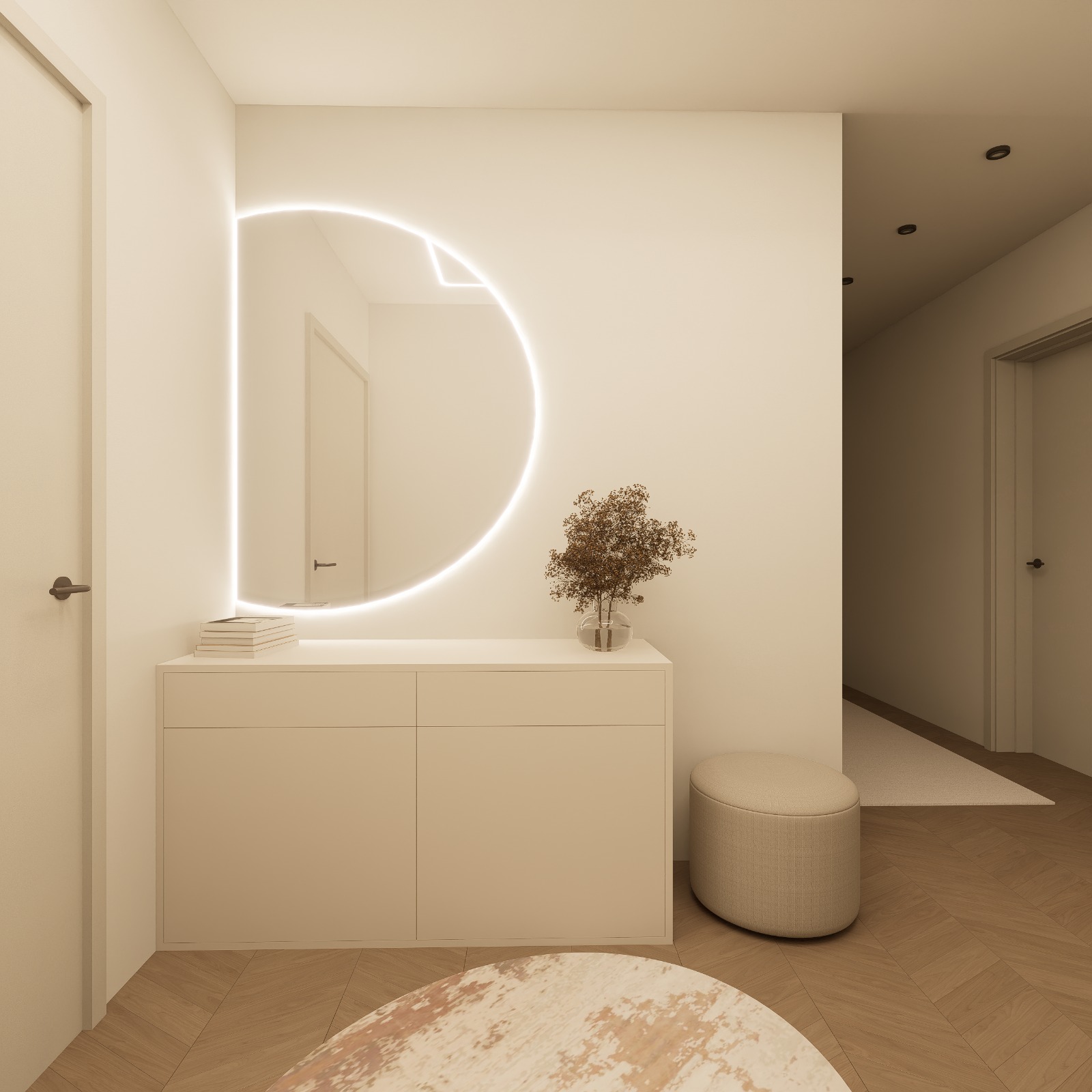 ultra realistic interior render keep exact same design layout proportions and camera angle do not change any geometry furniture placement mirror shape cabinet shape edges thickness or proportions do not move the camera materials console cabinet in matte beige lacquer with soft subtle reflections and clean edges walls in warm beige matte paint with slight micro texture mirror with integrated led light soft diffused glow clean edges no distortion floor in natural oak wood with visible grain and tonal variation ottoman in soft fabric with visible textile grain and natural compression decor objects in realistic materials glass paper ceramic with slight imperfections lighting strong natural daylight coming from the right side creating soft directional shadows slightly overexposed exterior for realism warm ceiling spotlights 3000k with realistic light falloff mirror led light soft and controlled not overexposed add subtle shadow gradients to avoid flat surfaces environment minimal and clean but realistic slight imperfections natural material behavior no additional objects style ultra photorealistic high end interior photography soft contrast natural imperfections 8k global illumination ray tracing strictly preserve original design no color deviation no perspective change