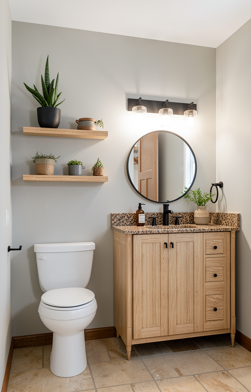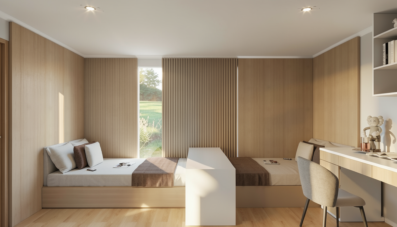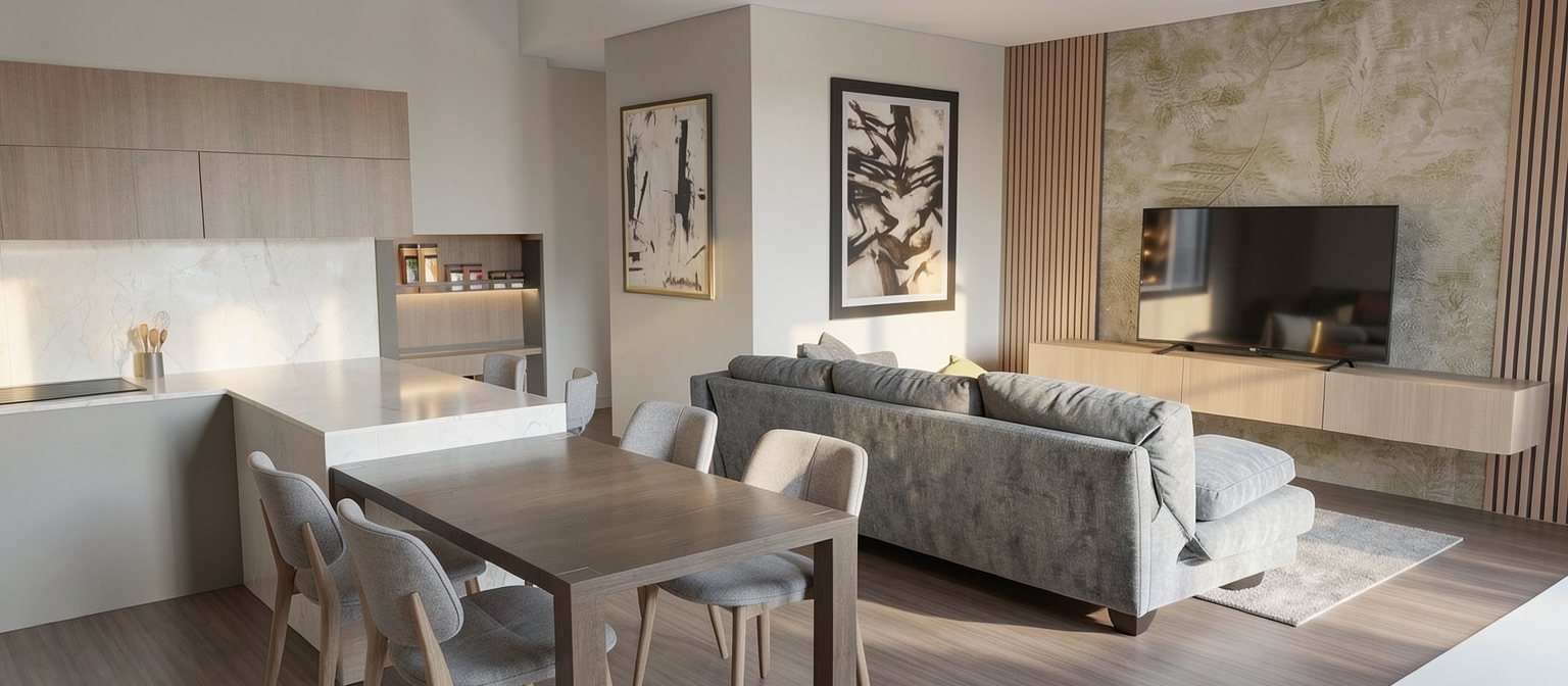 ultra realistic interior render keep exact same design layout proportions and camera angle do not change any geometry furniture placement mirror shape cabinet shape edges thickness or proportions do not move the camera materials console cabinet in matte beige lacquer with soft subtle reflections and clean edges walls in warm beige matte paint with slight micro texture mirror with integrated led light soft diffused glow clean edges no distortion floor in natural oak wood with visible grain and tonal variation ottoman in soft fabric with visible textile grain and natural compression decor objects in realistic materials glass paper ceramic with slight imperfections lighting strong natural daylight coming from the right side creating soft directional shadows slightly overexposed exterior for realism warm ceiling spotlights 3000k with realistic light falloff mirror led light soft and controlled not overexposed add subtle shadow gradients to avoid flat surfaces environment minimal and clean but realistic slight imperfections natural material behavior no additional objects style ultra photorealistic high end interior photography soft contrast natural imperfections 8k global illumination ray tracing strictly preserve original design no color deviation no perspective change