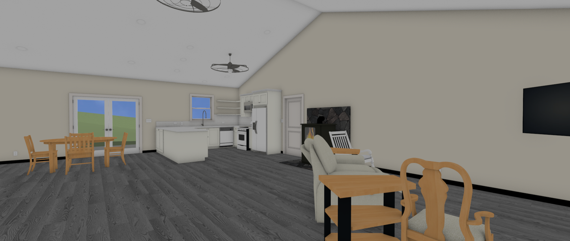 create a photorealistic high resolution render of an open concept living room dining area and kitchen interior maintain all dimensions proportions furniture placement and architectural details exactly as shown in the reference image mnt data 5b7174ef 6c3c 421c 94c5 ba166dc8a741 png the scene features kitchen with white cabinetry a center island white countertops stainless steel appliances open corner shelving and a single window above the sink dining area with a light wood round table and matching chairs positioned in front of double glass patio doors living area with a sofa armchair light wood side table television mounted on the right wall and a small black and stone fireplace along the same wall flooring is dark gray wood plank throughout walls are warm beige ceiling is vaulted with recessed lighting and two modern black ceiling fans lighting soft natural daylight filling the space modify the exterior visible through the patio doors and kitchen window replace the grass hill with a lush dense forest of tall trees layered greenery dappled sunlight and natural depth while keeping perspective and scale consistent overall style ultra photorealistic crisp textures accurate lighting high resolution architectural visualization