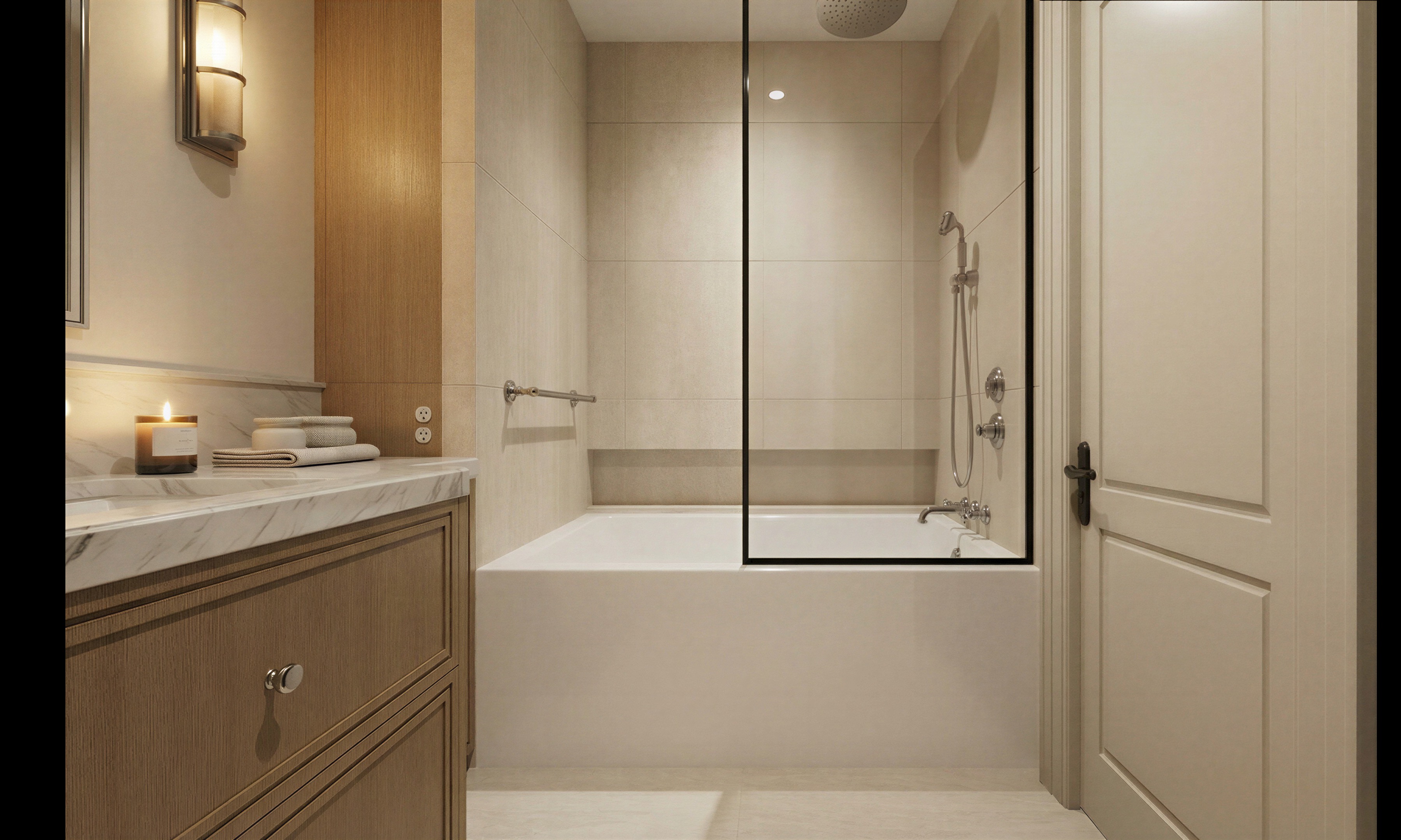 keep everything the same just change the floor and make the same neutral tile but make it an herringbone pattern on the floor only