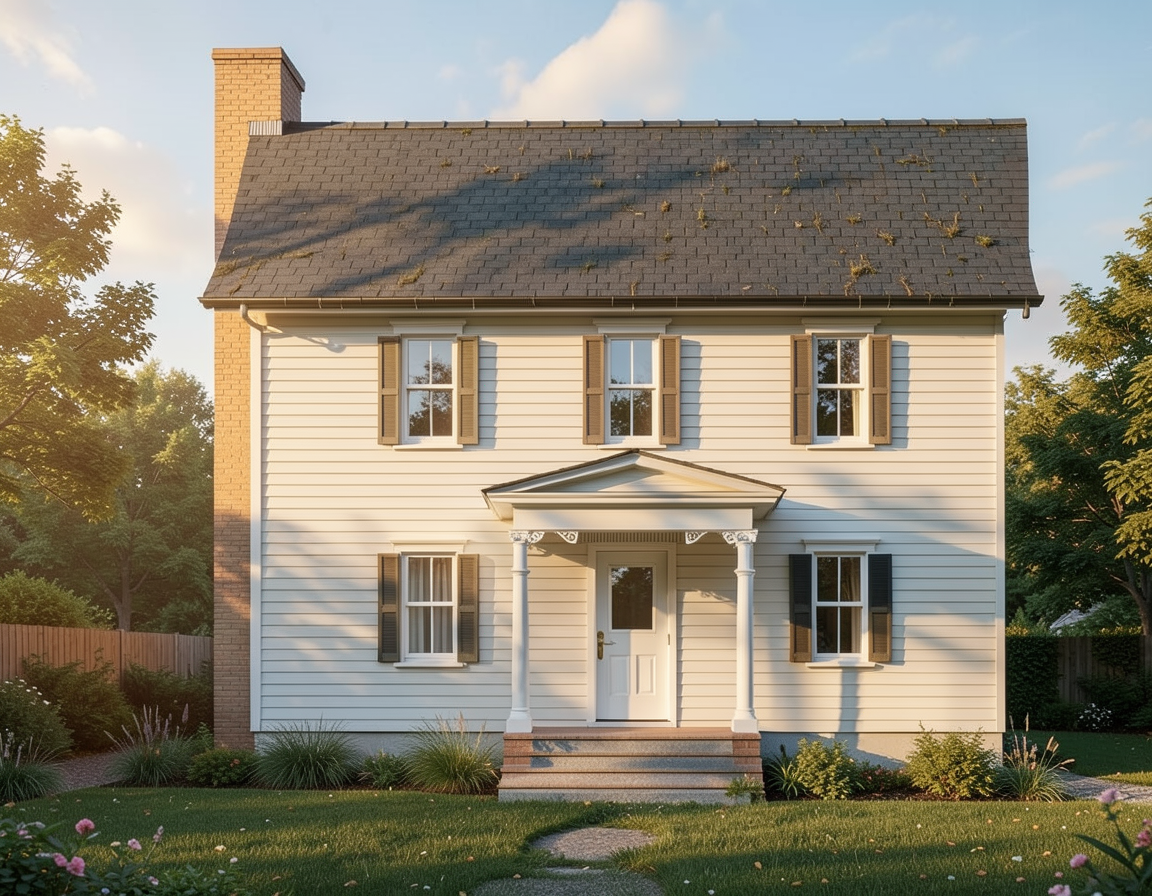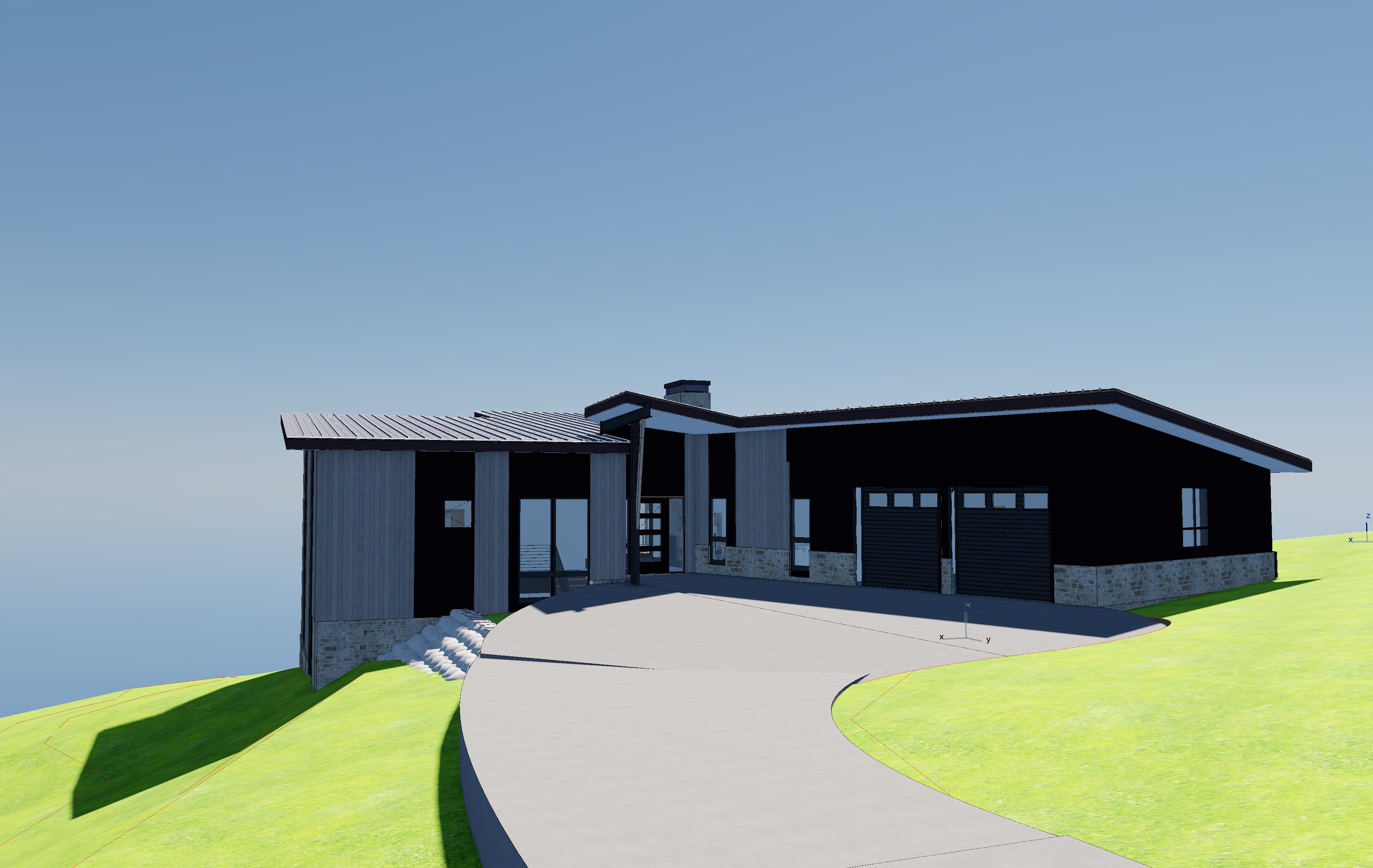 mountain modern ski home warm light emanating from the windows vertical siding in grey areas and horizontal siding in black areas snowy pine forest around the home and distant low mountains alpine glow from behind the camera