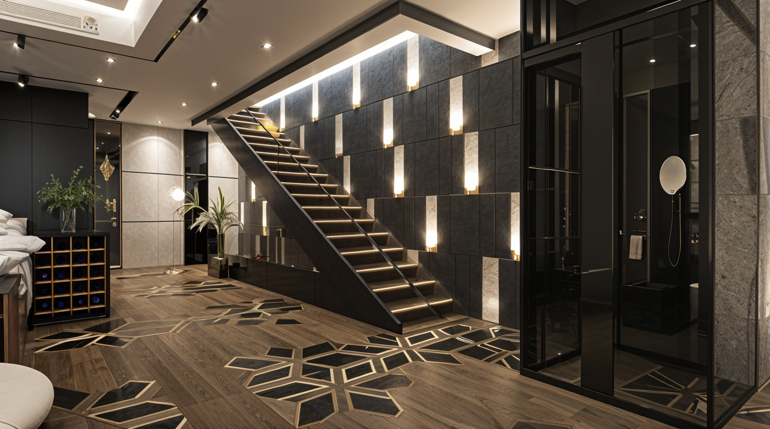 create a photorealistic render architectural render style from this image staircase material should be white plaster and wood following proposed materials render all the flooring in light beige natural stone tiles matte with some texture for the context around the house show only simple grass on the right and a simple terrace floor on the left there are no neighbours replace the sculptures under the stairs for plants creating a planter inserted into the wooden base of the stairs replace the art proposed on the right side wall for some other well curated art arrangement in the same art style modern but not too flashy very stylish