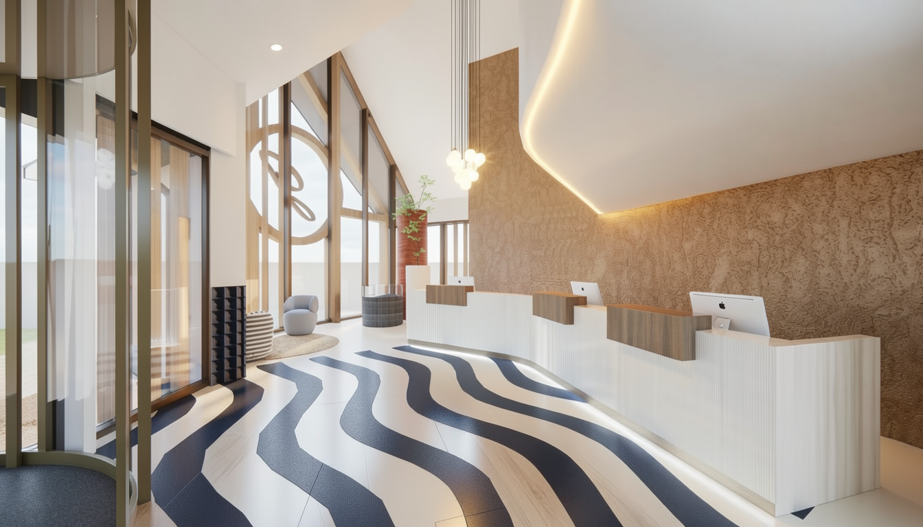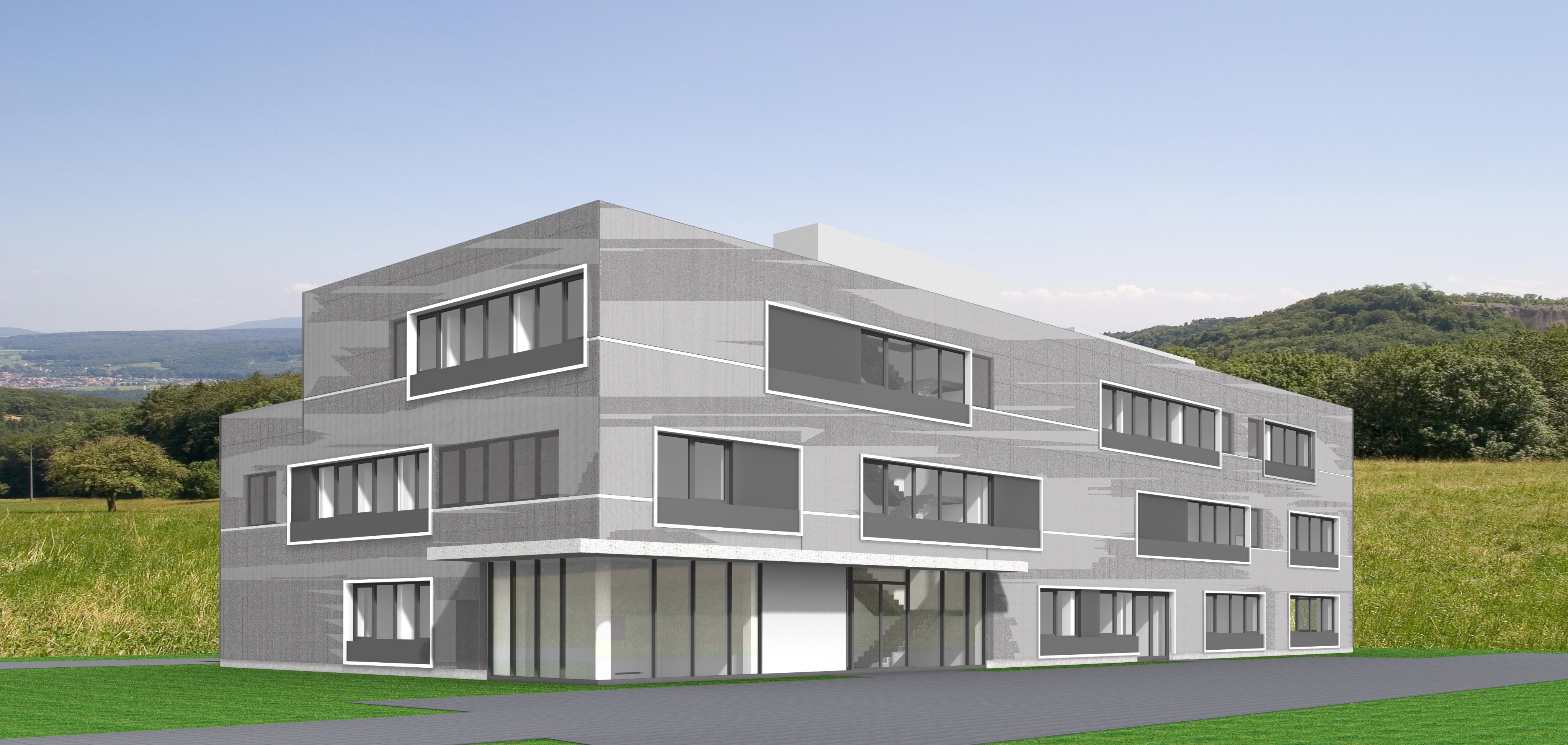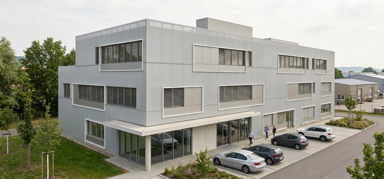 create a photorealistic architectural render of the provided building while preserving the exact geometry proportions facade rhythm openings roof form and camera angle from the source image do not redesign the architecture the main facade surface must be executed as perforated corrugated metal in ral 9006 this main facade must clearly read as perforated corrugated sheet metal in ral 9006 and must remain the dominant facade material inside the existing facade frames use smooth sheet metal panels in ral 9007 these inner panels must be clearly smooth flat non perforated sheet metal in ral 9007 apply ral 9007 only to the infill panels inside the facade frames do not apply ral 9007 to the main facade surface keep all existing facade frames exactly as they are in the reference image unchanged in size position depth proportion and appearance keep all window frames exactly as they are as well the rooftop structure roof extension must remain finished in ral 9006 important top edge rule do not create any upper closure metal no parapet flashing no attic coping metal no metal cap no sheet metal top cover no trim piece and no closing profile at the top of the facade there must be absolutely no visible upper closure sheet at the facade the perforated corrugated facade must run openly upward and end open at the top edge the facade must not be closed with any metal flashing or cover important louver rule do not show any jalousies louvers shutters blinds external blinds or sunshade slats anywhere on the facade or in front of the windows the horizontal divisions in the perforated corrugated facade must not appear as applied bands or cover strips they must read only as precise horizontal joints shadow gaps panel seams between the corrugated metal sheets any windows located behind the perforated corrugated metal must remain clearly readable as windows behind the perforated screen wherever visible in the reference image do not reinterpret them as opaque solid panels the canopy must be expressed in exposed concrete the wall below the canopy must also be in exposed concrete the round column underneath the canopy located at the building corner behind the glazing must remain clearly visible through the glass and must also be finished in exposed concrete arrange a small clearly organized parking area in front of the right side facade of the building show only two to three cars in total all cars must be parked exclusively within this parking area and always orthogonally to the facade at a strict 90 degree angle the cars must be aligned neatly in clearly readable parking bays no diagonal parking no parallel parking no random vehicle placement no overlapping cars no distorted vehicles and no cars on grass planting areas or pedestrian paths add only very few people to the scene placed subtly and realistically in plausible pedestrian areas such as near the entrance or along the forecourt the people must remain secondary to the architecture create a friendly and slightly warmer summer atmosphere with a calm elegant and inviting competition style architectural ambiance the overall environment should feel welcoming pleasant and refined in the background show a flat commercial area with low rise warehouse buildings and simple industrial halls understated and secondary to the main building on the left side in front of the building there must be only a green grass area with no street no road and no sidewalk close to the building itself include a few trees and restrained planting to create a greener and softer immediate setting keep all planting clearly separated from paved circulation and parking areas use soft neutral summer daylight with diffused light very gentle shadows and balanced exposure minimize direct sunlight on the facade keep reflections very soft and controlled the facade should remain evenly lit clearly readable and free from harsh glare bright specular highlights or strong reflections no morning light no evening light no golden hour no sunset mood and no dramatic sky the final image should be refined realistic professional welcoming and suitable for a high end architectural competition presentation create a photorealistic architectural render of the provided building while preserving the exact geometry proportions facade rhythm openings roof form and camera angle from the source image do not redesign the architecture the main facade surface must be executed as perforated corrugated metal in ral 9006 this perforated corrugated metal must continue across and in front of the window areas wherever these windows are located outside the facade frames in these areas the perforated corrugated metal must read as an external screen layer in front of the windows with the windows still visible behind it the perforated corrugated metal in ral 9006 must remain the dominant main facade material inside the existing facade frames use smooth sheet metal panels in ral 9007 these inner panels must be clearly smooth flat non perforated sheet metal in ral 9007 apply ral 9007 only to the infill panels inside the facade frames do not apply ral 9007 to the main facade surface keep all existing facade frames exactly as they are in the reference image unchanged in size position depth proportion and appearance keep all window frames exactly as they are as well the rooftop structure roof extension must remain finished in ral 9006 important top edge rule there must be no attic no visible parapet no parapet flashing no attic coping metal no metal cap no sheet metal top cover no trim piece and no closing profile at the top of the facade there must be absolutely no visible attika and no upper closure sheet at the facade the perforated corrugated facade must run openly upward and end open at the top edge the top of the corrugated metal facade must remain visibly open and unclosed important joint rule the horizontal divisions in the perforated corrugated facade must be recessed inward and must read only as inward sheet metal butt joints panel