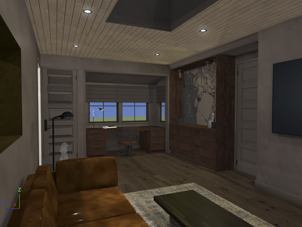 make it realistic moody modern keep everything light up the niche on the left wall with bronze insert walls get rid of the z x lines change the coffee table for dark wood