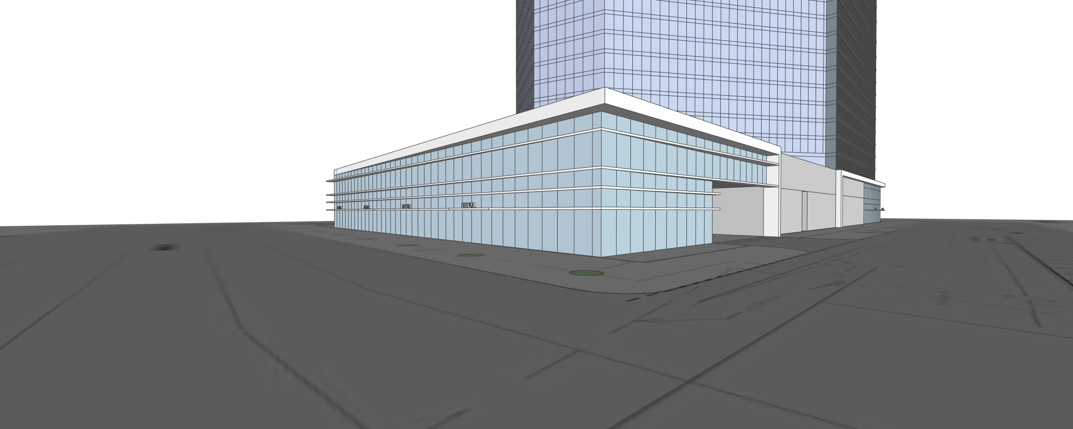white background do not change massing add retail at ground level remove cars