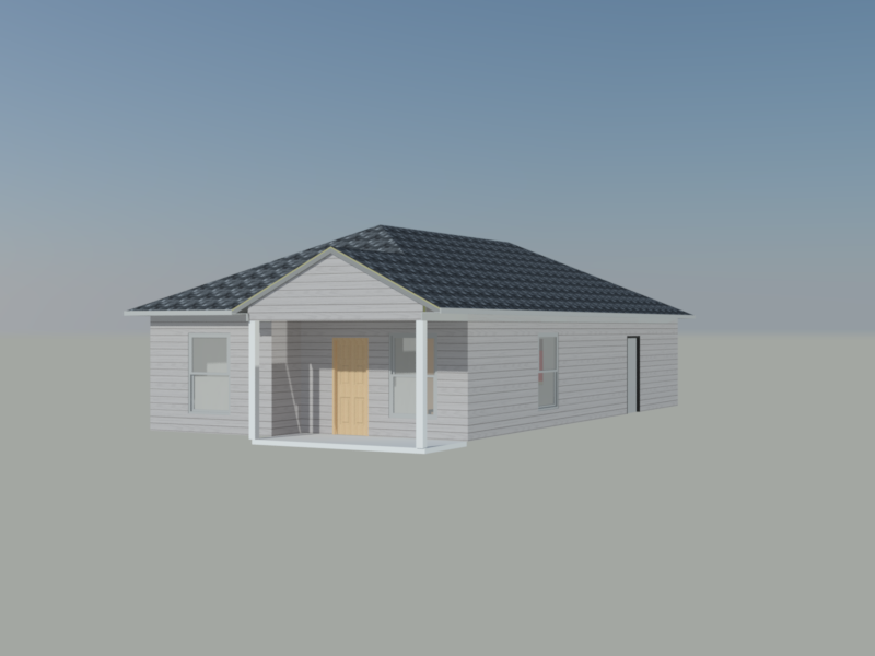 create a beautiful render of a quaint single story house with a front porch use soft gray for the siding shingle roof and a warm light blue tone for the front door add white accents for the windows and porch pillars surround the house with a serene clear sky of gradient blue evoking a peaceful calm atmosphere the overall mood should be inviting and tranquil with gentle lighting enhancing the details