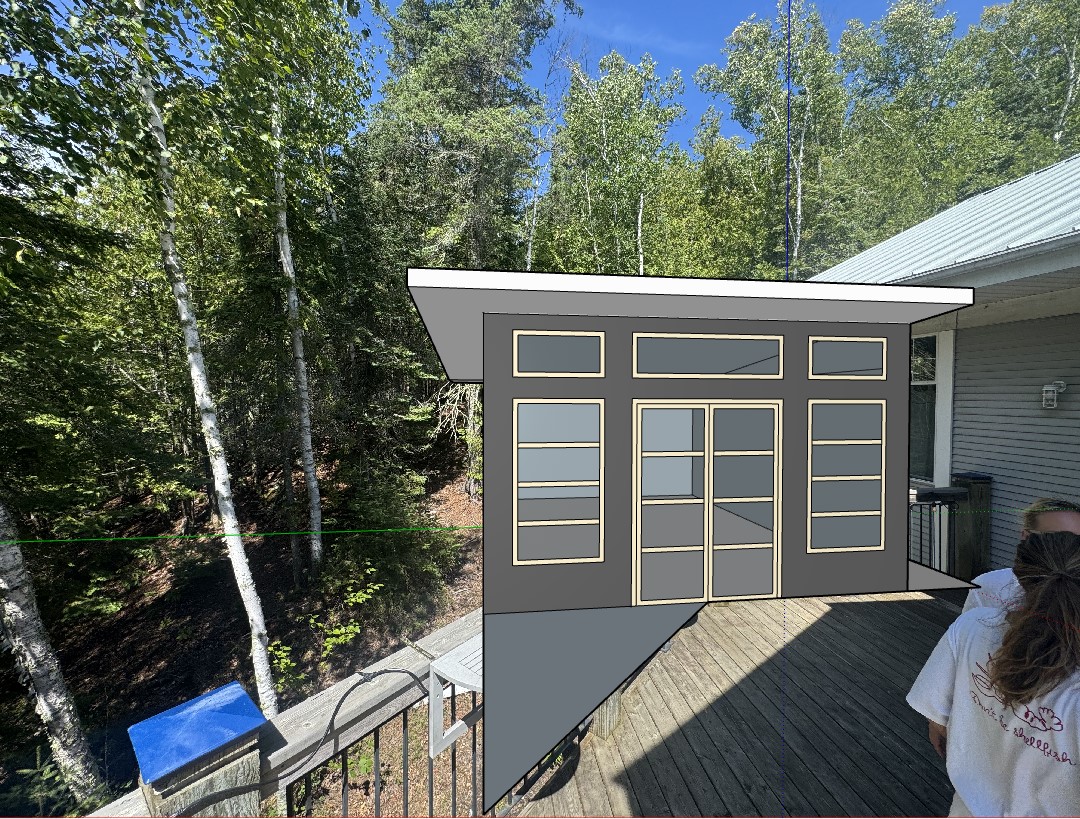 make the windows white to match the others the siding on the new gazebo structure should match the building blend the brown decking in on the floor dont alter the background