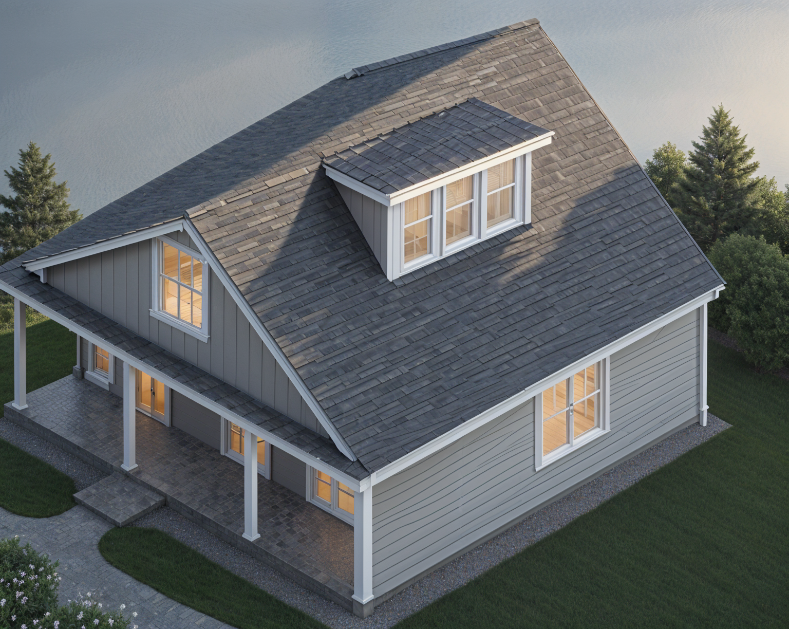 white farm house with black roofs make it evening with soft lights in windows on a horse ranch