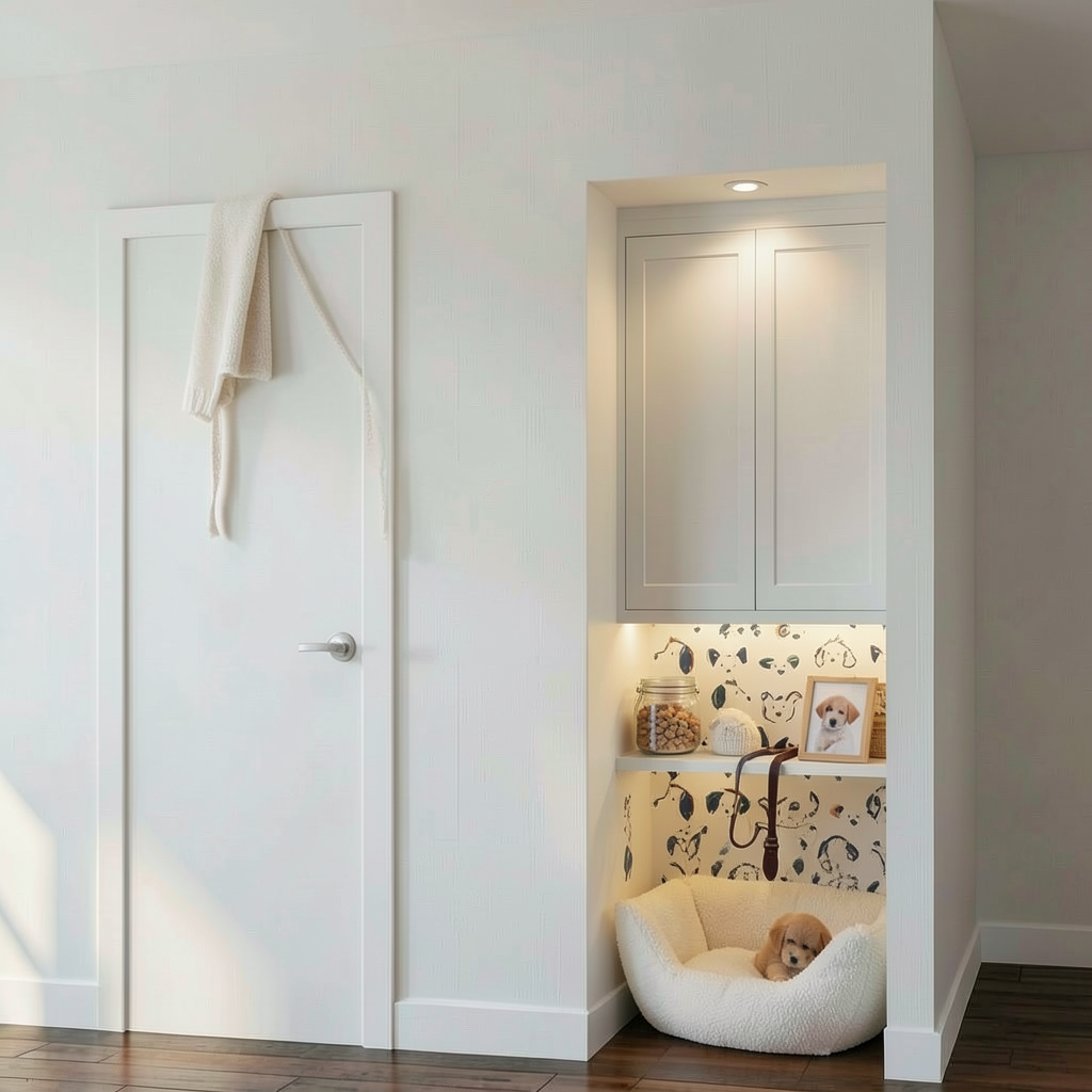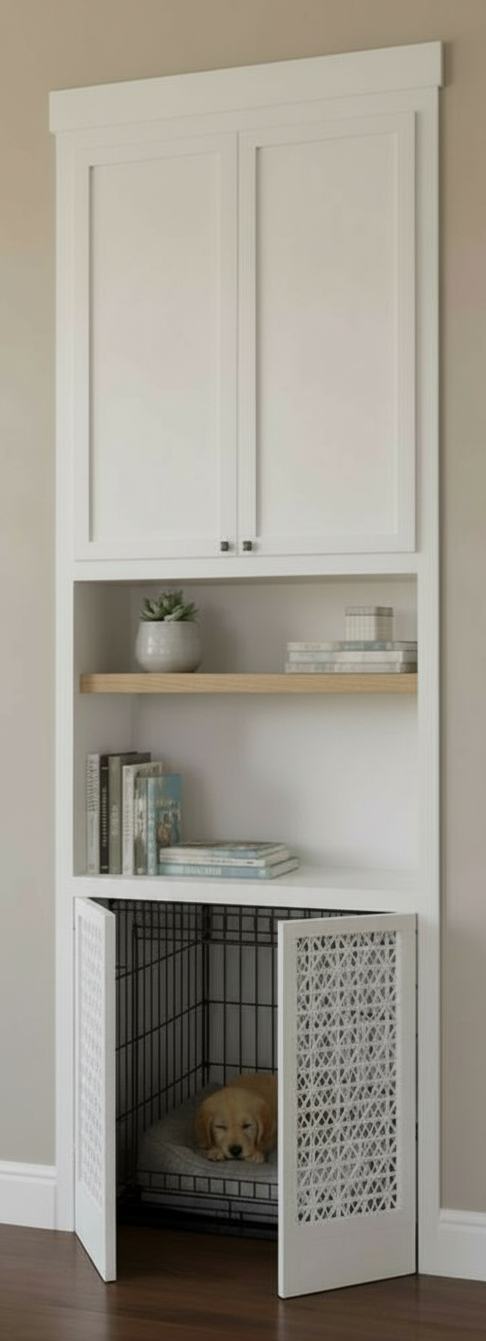 can you remove the dog crate and just have a doggy bed there instead and add some puppy related accessories to the shelf jar of treats leash picture of a puppy