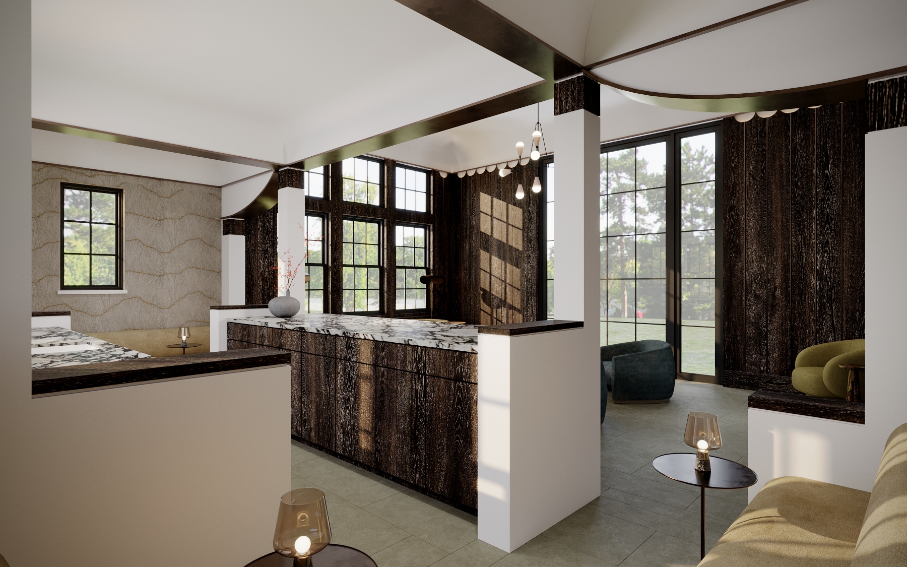 make the existing wood walls an ebony stain and the cabinetry fronts that are wood the same ebony stain do not change the walls that do not have wood