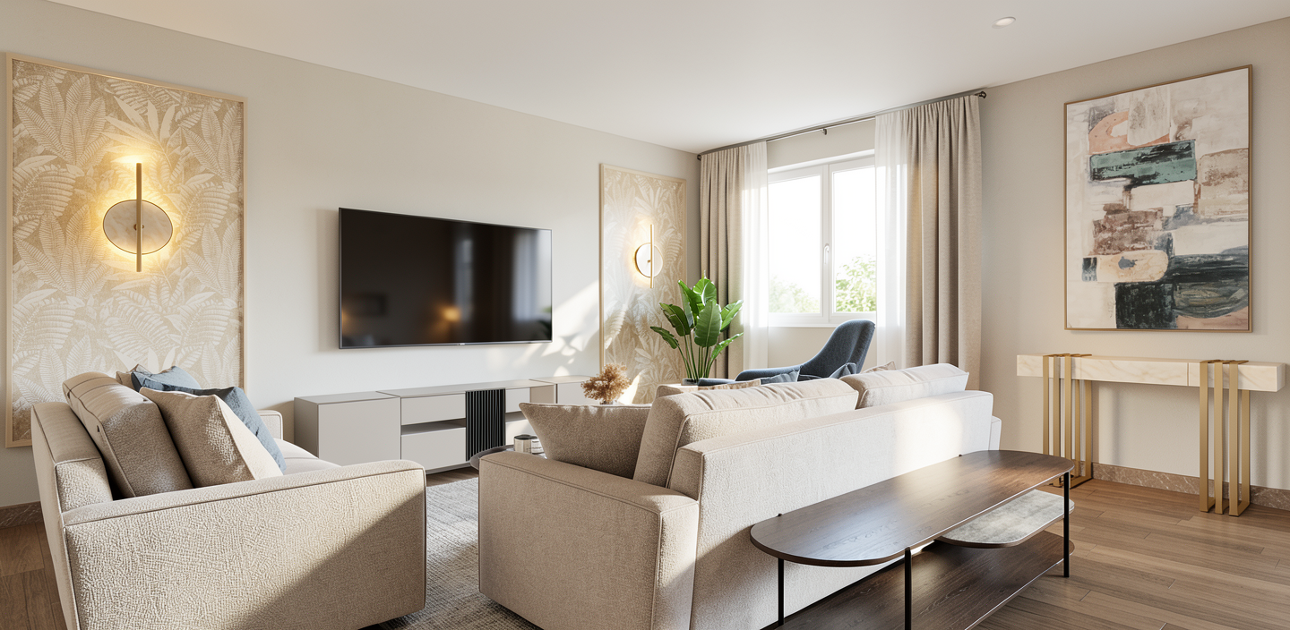 crea una imagen fotorrealista a partir de este sketchup el paple pintado de los paneles es mucho claro y los apliques son de alabastro a ade algo de decoracion encima de la camamera detras del sofa elimina las plantas que estan el mueble debajo de la tv