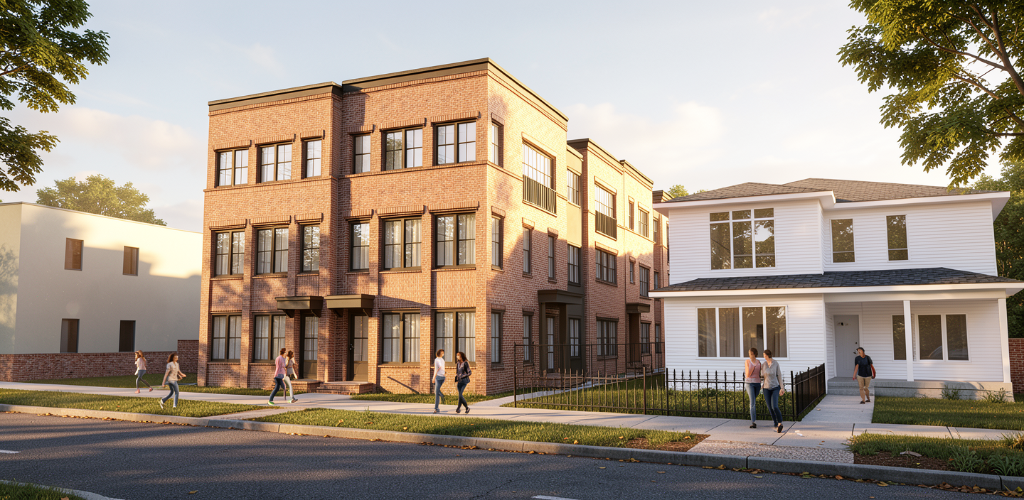 late morning lighting foursquare house to the right with white lap siding iron railing between white and brick buildings car driving past