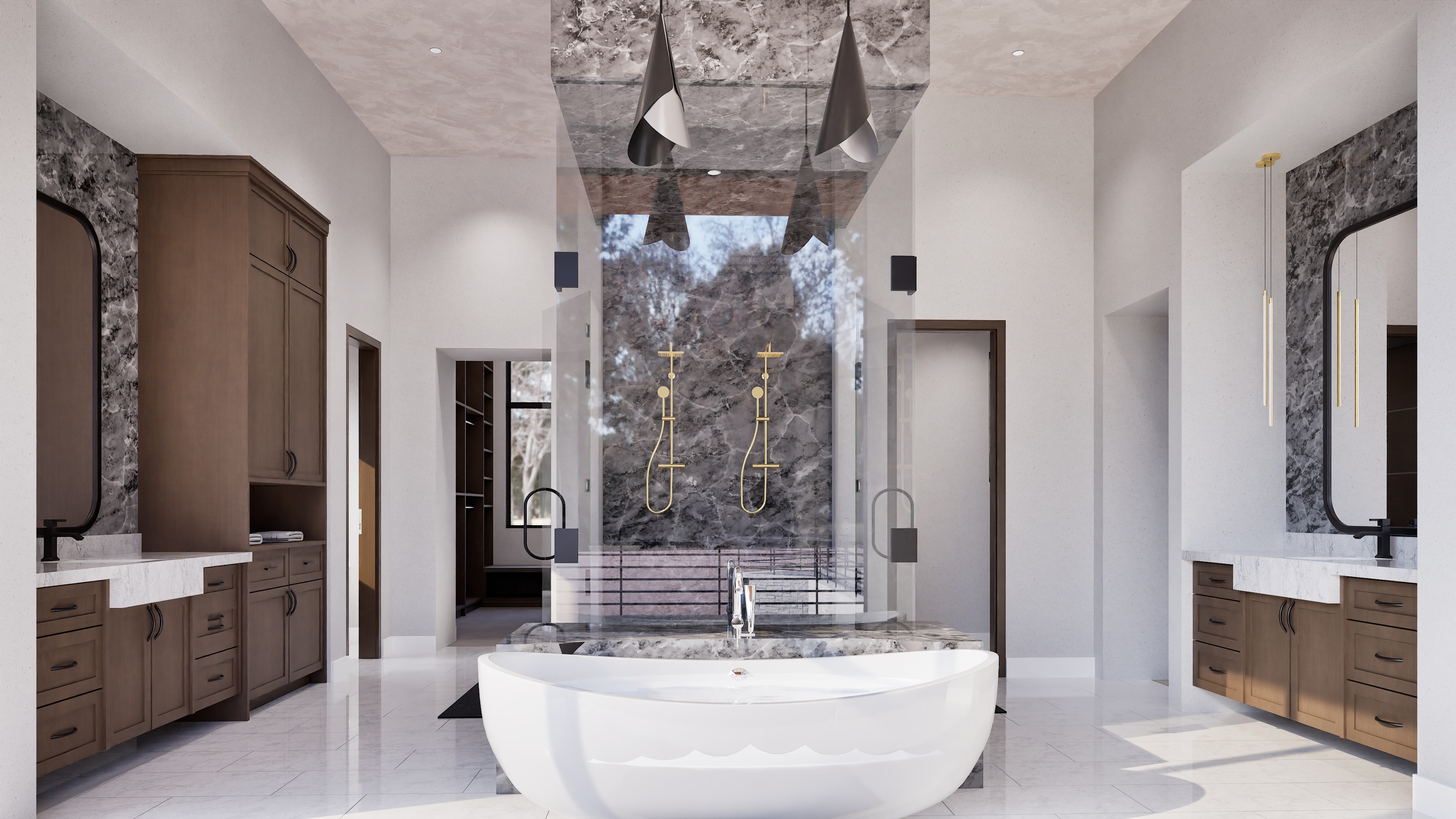 the image is a modern luxury bathroom with the following materials brown wood cabinetry white marble countertop black marble for the shower and backsplash and a white tile for the floor enhance each of those materials to be more natural and realistic in texture and reflectivity and shadow enhance the lighting in the room to be a dull warm with the light path being directly behind the camera into the room add water into the bath tub add a fabric texture to the walls