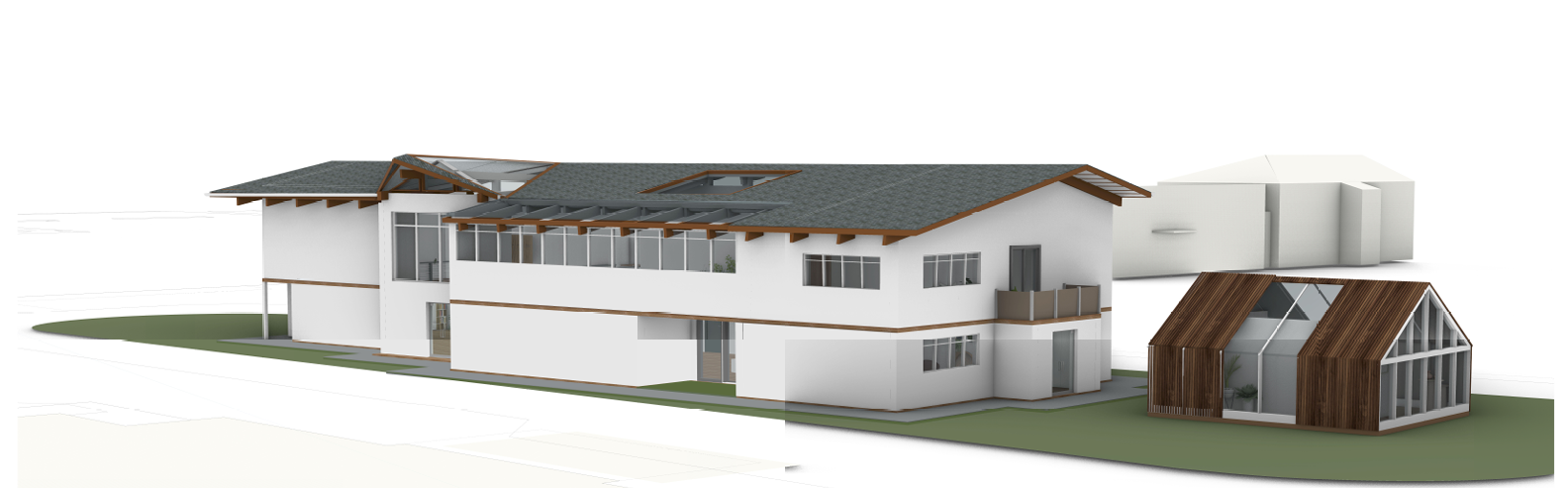 add trees on the green area and some people add two people on wheelchair and some tall trees do less people and keep the road but not people on the road the road is right in front of the building also this is the front part of the building