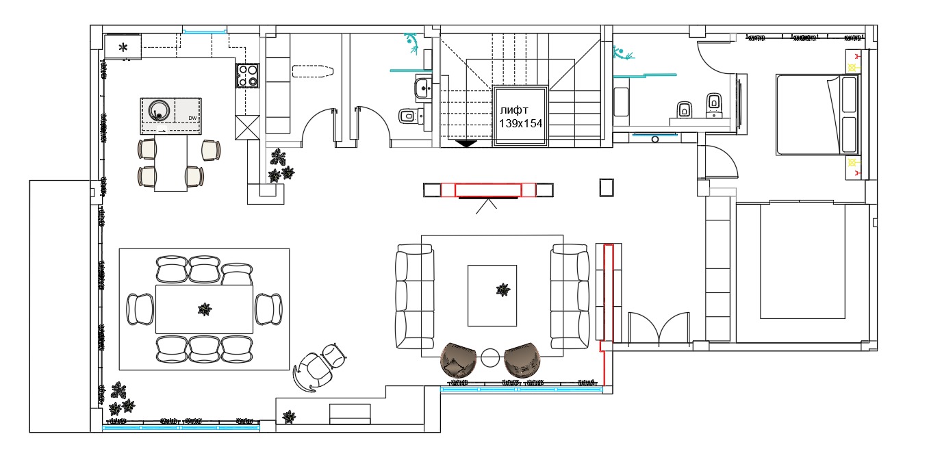 convert this floor plan into a realistic isometric 3d view of a full house show the space from an elevated angle with furniture walls and details visible a beautifully rendered architectural floor plan showcasing a vibrant and modern aesthetic the walls should be depicted in a sleek toned beige conveying stability and elegance furnishings and built in fixtures like kitchen counters and sofas are with luxury finishes exuding energy and sophistication soft lighting fills the space with ambient golden hues illuminating key areas to create warmth and luxury flooring is big granite beige tiles with different tiles in bathrooms to complete the atmosphere lush greenery is strategically placed offering a refreshing contrast and enhancing the serene refined ambiance throughout the layout use the same furniture as shows on the plan do not change the orientation of the floorplan