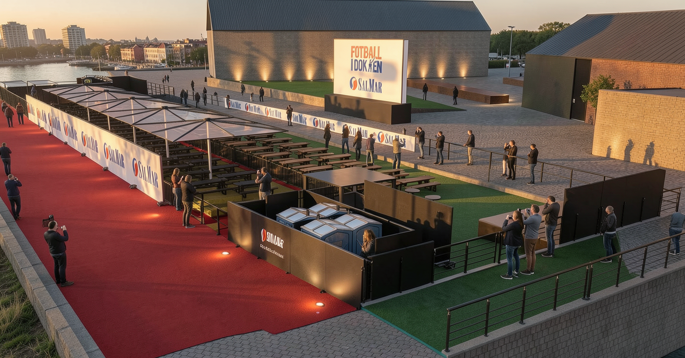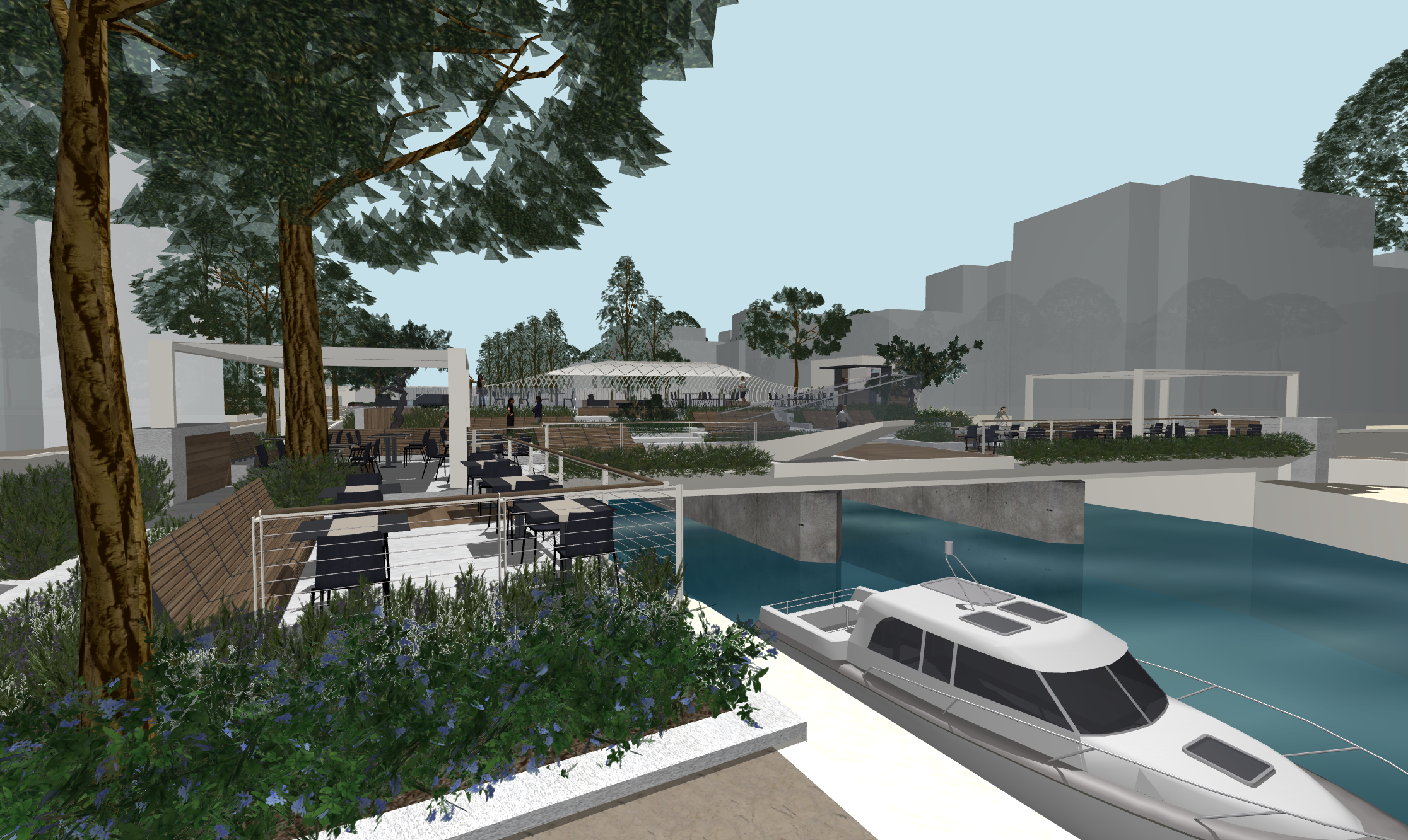 a new urban furnishing on a bridge newly laid teak flooring a sunny day with many people walking and talking to each other