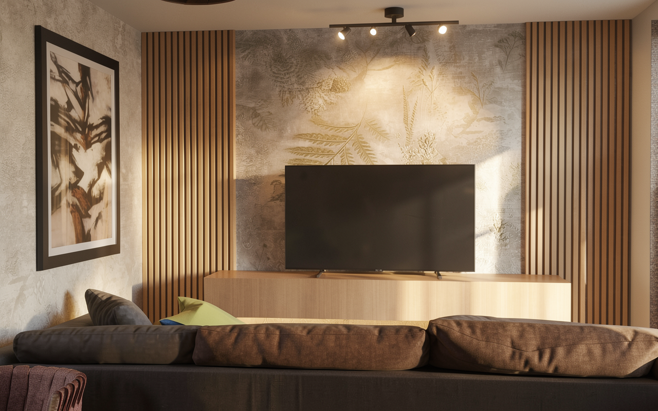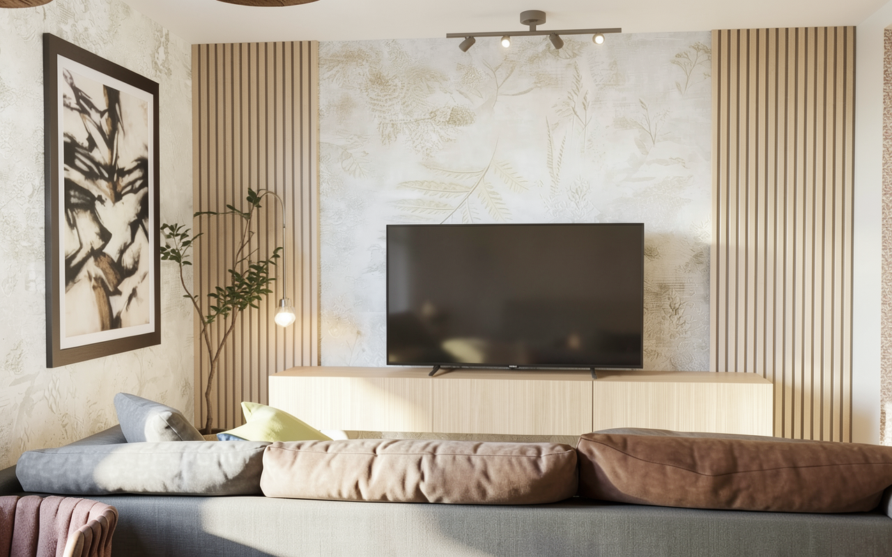 use the uploaded moodboard as design reference only to create one cohesive interior space visual do not blend collage or overlay the moodboard images together instead interpret the images and translate the materials colours textures furniture style and overall atmosphere into a single realistic interior scene the output should look like a photorealistic architectural render of a real space not a moodboard maintain the same design language palette and material qualities seen in the references but apply them naturally within one room layout focus on spatial composition realistic scale and coherent interior design lighting should be soft and natural enhancing the materials and atmosphere avoid duplicating the reference images text or graphic layout from the moodboard