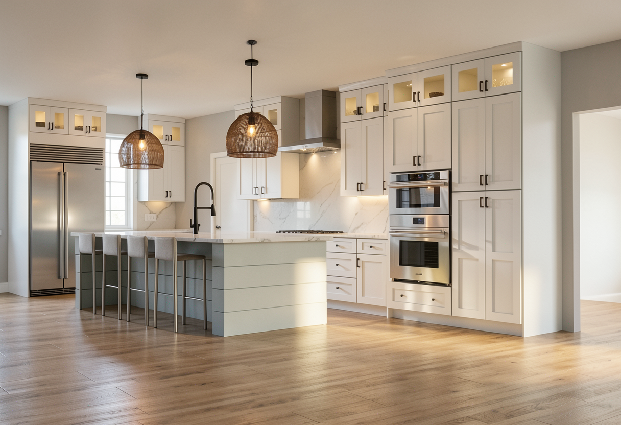 render an interior elevation of the exact midcentury modern kitchen in the interior elevation drawing on a sunny day with warm white walls walnut wood cabinets that go to the ceiling of the standard height room white industrial appliances with brass hardware a painted plaster simple square vent hood simple brass cabinet hardware a terracotta and cream checkered tile backsplash that goes from the countertop to the base of the cabinets only and has a white stone shelf on top between cabinets under the vent hood right of the refrigerator is a darker walnut wood door the built in bench on the right is made of wood to match the cabinets and has vertical tufted cushions in a terracotta colored linen fabric the bench has a brass rail on top there is a wood floating shelf on the wall above the bench at the same height as the stone shelf there is a cabinet of drawers facing the refrigerator behind the bench do not zoom back far enough to see walls beyond the cabinets in the image