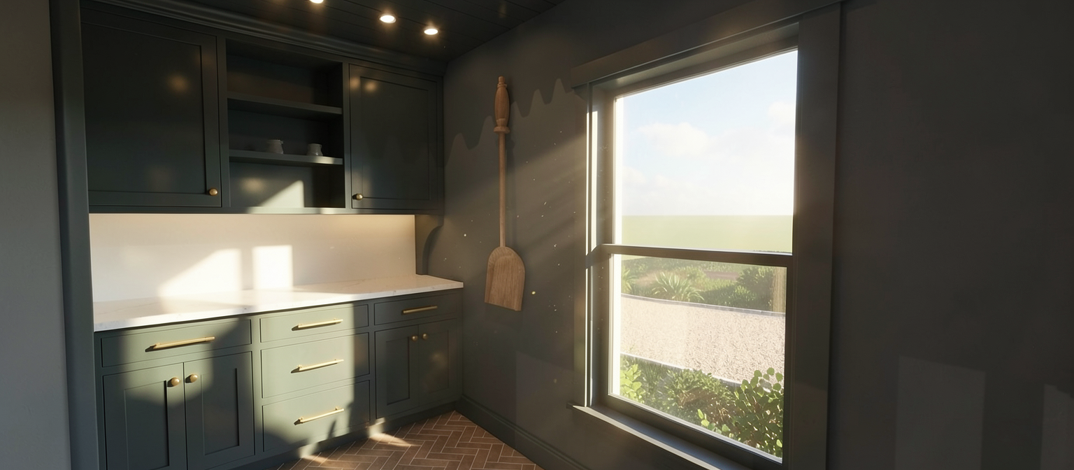 create a realistic rendering with dramatic natural light streaming through the window and remove the jagged dark shadow from the picture and make the walls and cabinetry a dusty blue