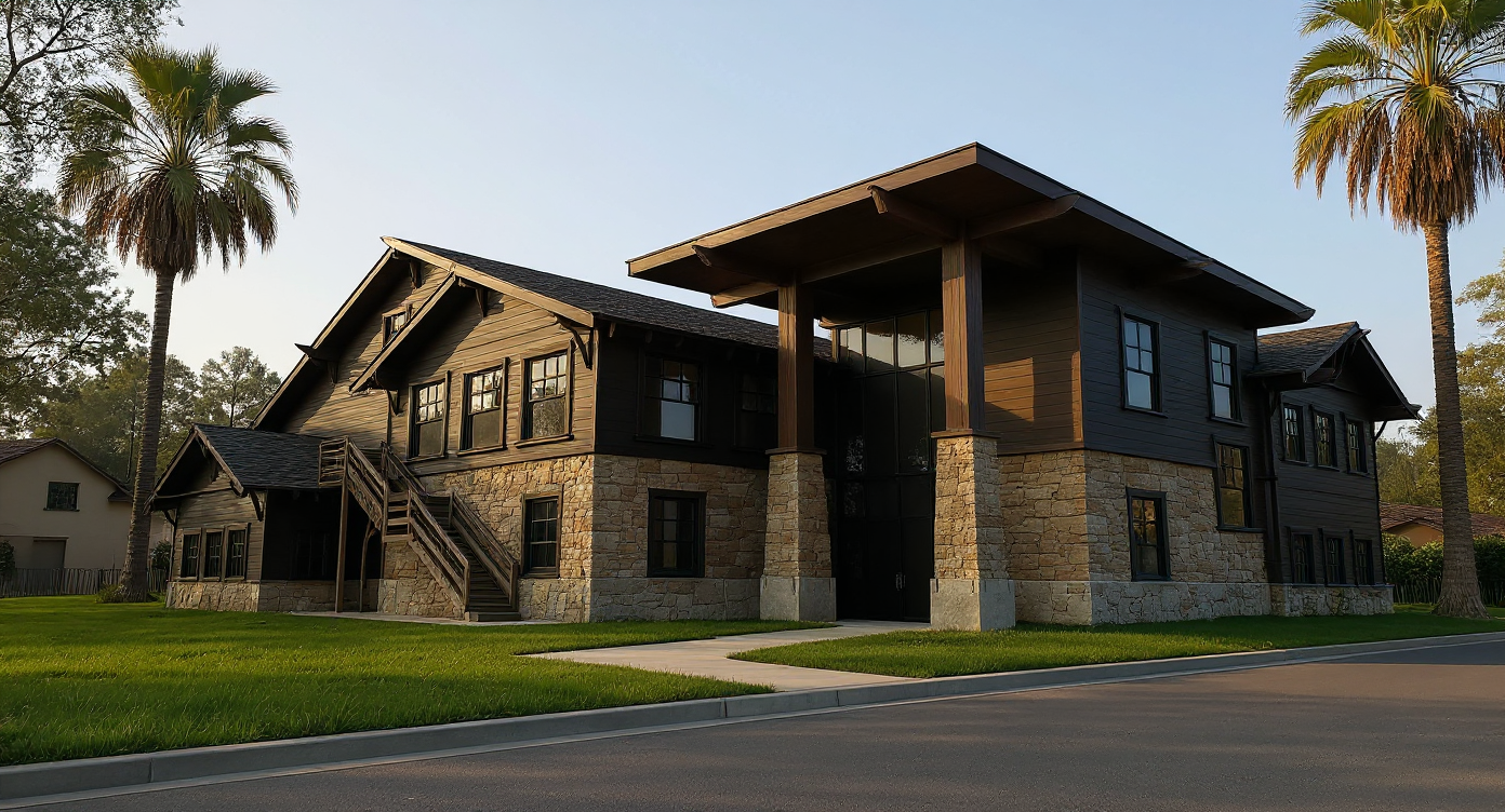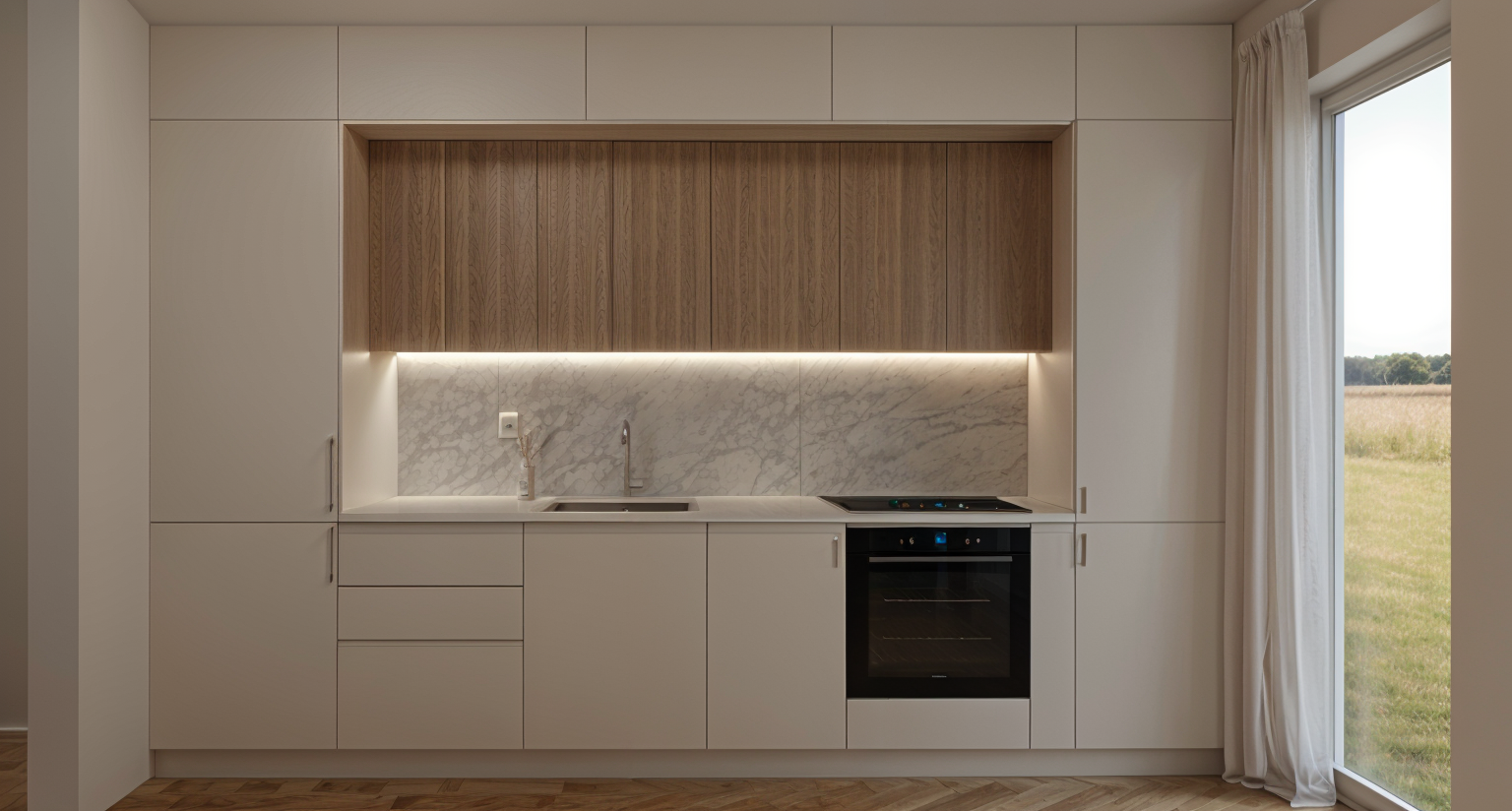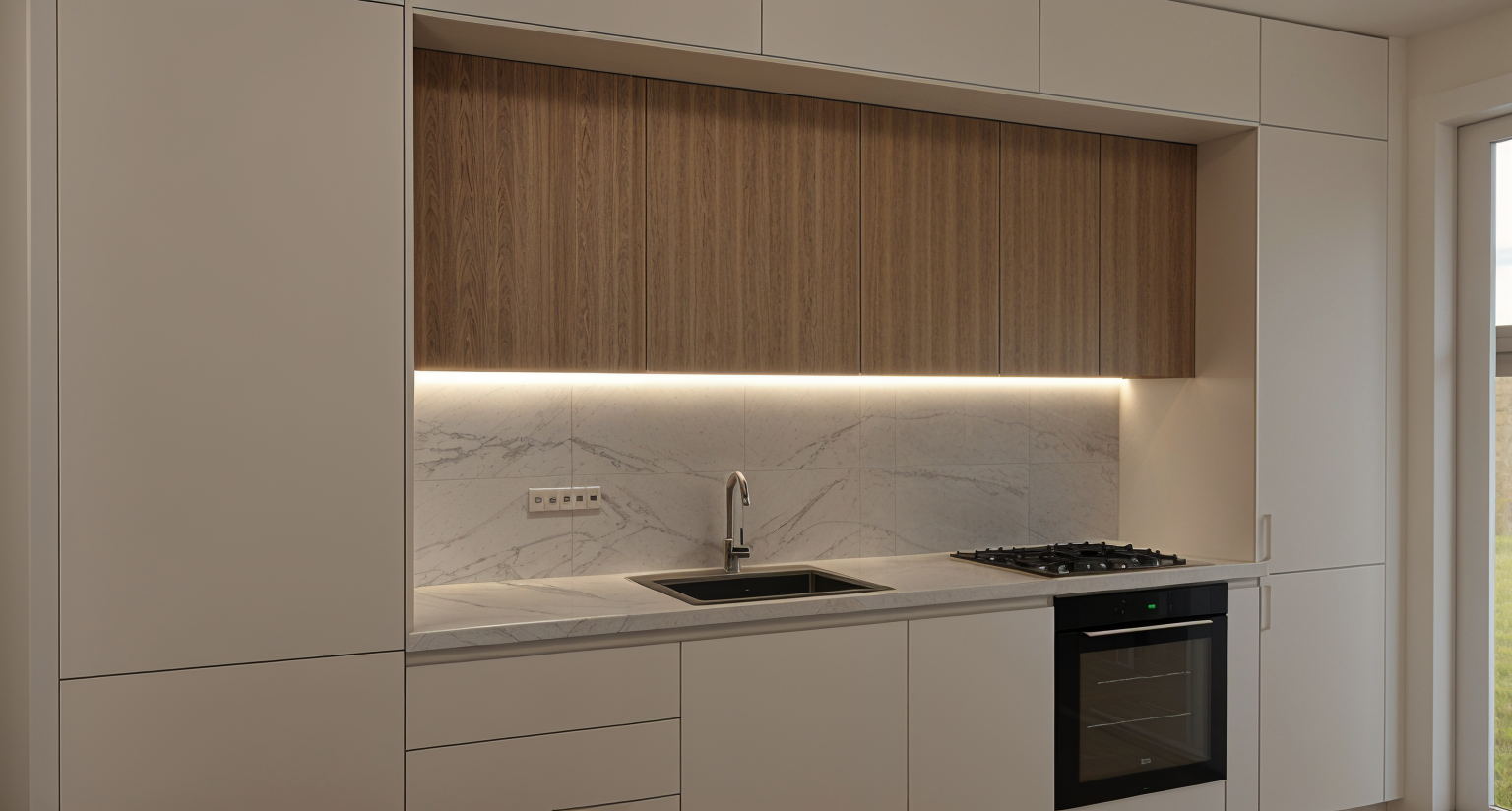 enhance the existing interior render of the living room composition exactly as it is keeping all geometry materials colors and textures completely unchanged maintain the fireplace cabinetry shelving wall panels flooring and all design elements exactly as they appear only refine the lighting and atmosphere soften the light reduce harsh highlights and eliminate the strong yellow cast create a smooth calm refined mood with soft natural illumination gentle shadows and balanced neutral color temperature the result should feel serene high end and photorealistic similar to luxury architectural photography without changing any objects proportions materials or layout