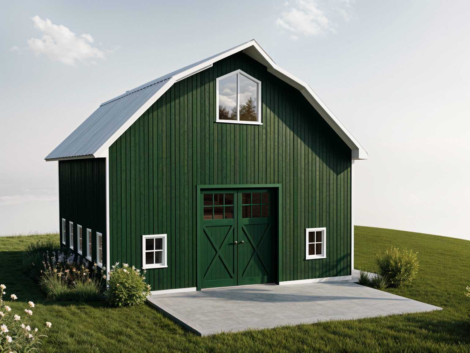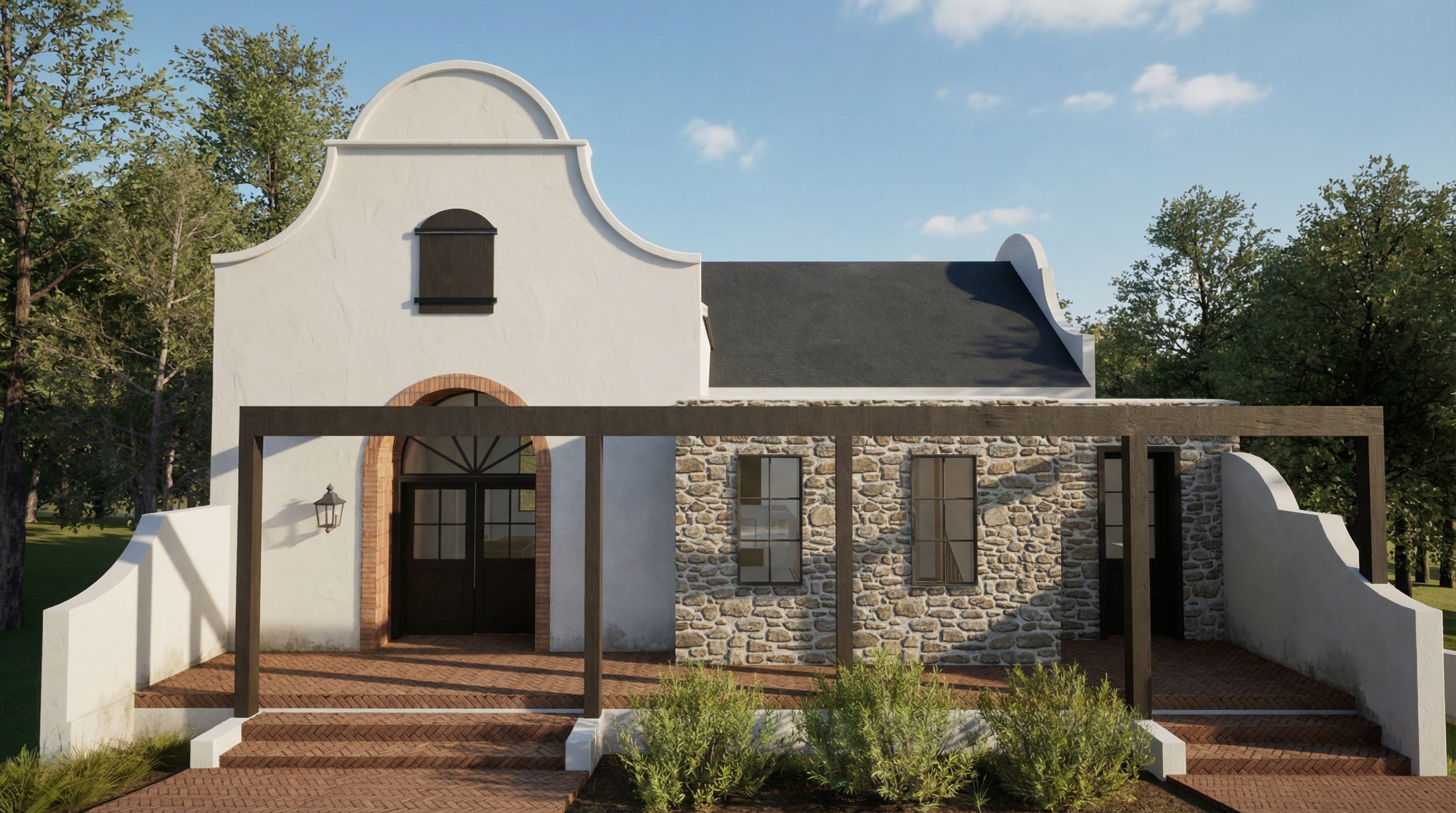 create an ultra photorealistic architectural rendering of this exact house keep the architecture proportions rooflines wall shapes window placement pergola structure stairs and layout exactly the same do not change any geometry or design elements maintain the white smooth stucco facade with soft natural texture variation subtle trowel movement and realistic light shadow transitions the stone wall should appear as real natural fieldstone with depth irregular mortar joints subtle color variation grays warm tans and realistic surface roughness the pergola should be dark stained wood with visible wood grain slight weathering natural imperfections and soft shadow casting the brick paving and steps should show authentic clay brick texture with slight color variation realistic joint lines and soft wear the black metal windows and doors should have realistic reflections subtle glass glare and accurate mullion depth add faint interior depth behind the glass dim interior shadows not flat white improve lighting to natural late afternoon warm sunlight with long soft shadows and ambient bounce light add realistic sky lighting and global illumination enhance landscaping with more natural variation slightly irregular plant spacing realistic leaf texture soft wind movement feel natural ground cover and soil variation add subtle environmental realism light weathering at stucco base slight dirt variation at grade soft edge shadowing under trim realistic shadow softness under pergola render as high resolution architectural photography 50mm lens feel eye level perspective cinematic depth extremely realistic materials natural color grading no stylization no design changes architectural photography style similar to luxury atlanta residential homes refined and timeless aesthetic subtle film grain realistic dynamic range professional real estate photography lighting not overly saturated not stylized true material color accuracy