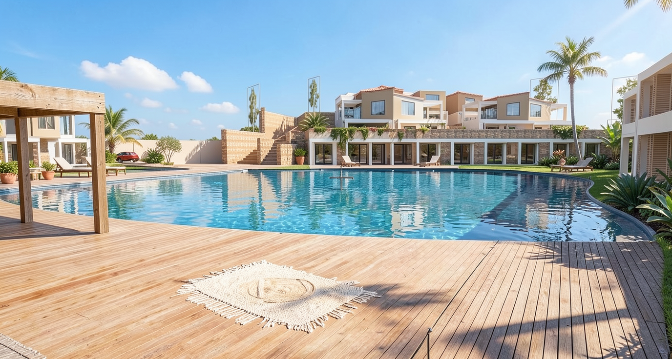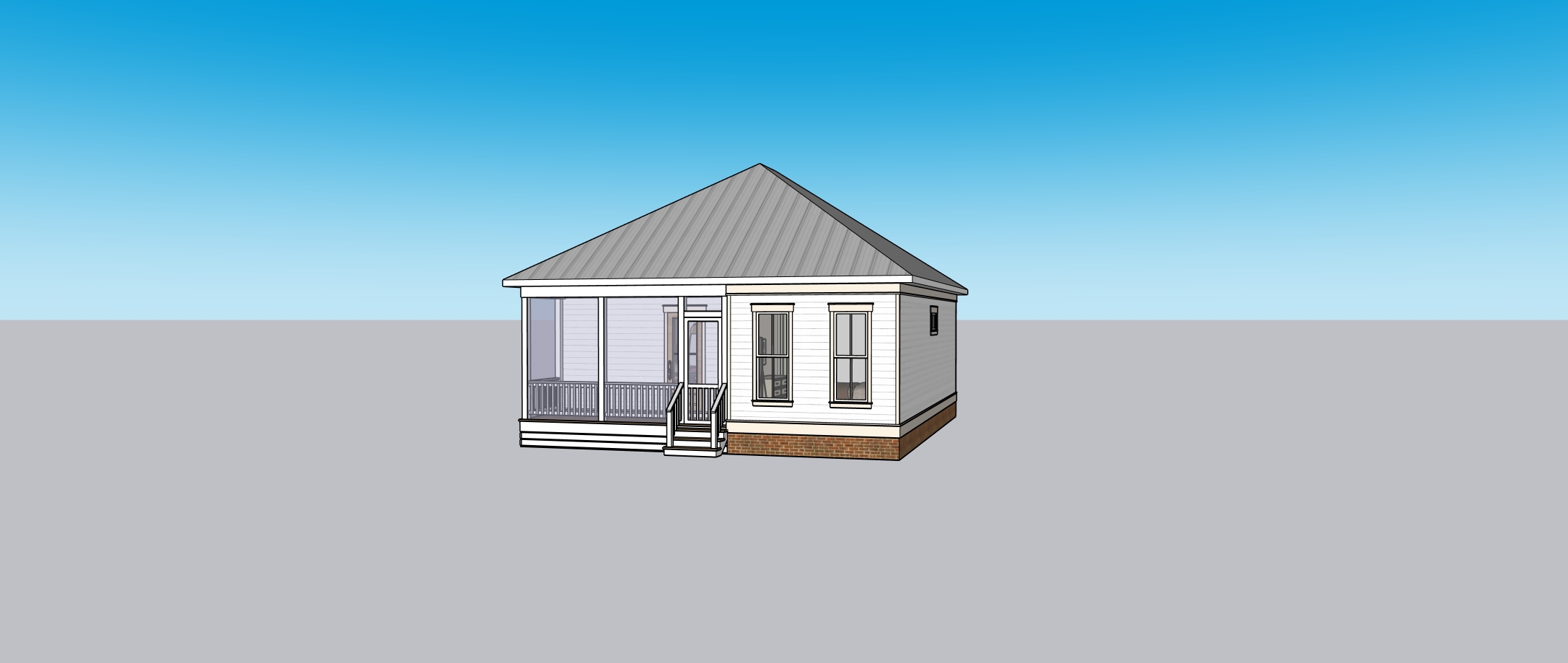 render to make look realistic maintaining the overall structure and properties white horizontal siding white posts and railing white horizontal boards under the deck red brick skirt white windows rear screened in deck gray metal roof