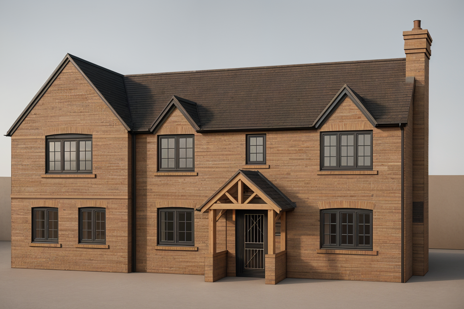 add curtrains behind the windows change trees for oak trees point sun on facade