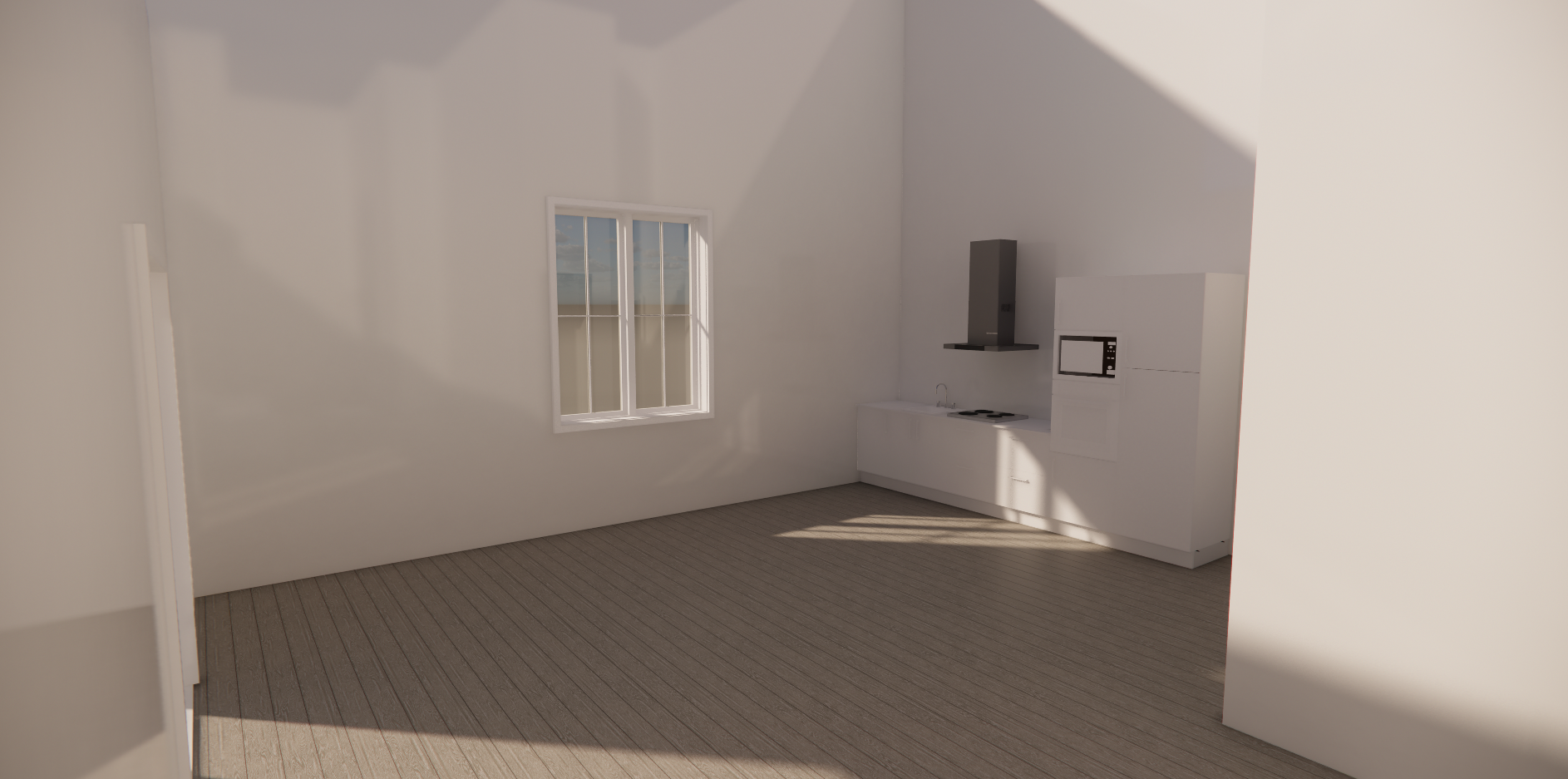create a beautiful kitchen with an island and chairs this kitchen is positioned infront of the front door dont mess up the layout or add a door make the kitchen just on one side with an island with nice chairs