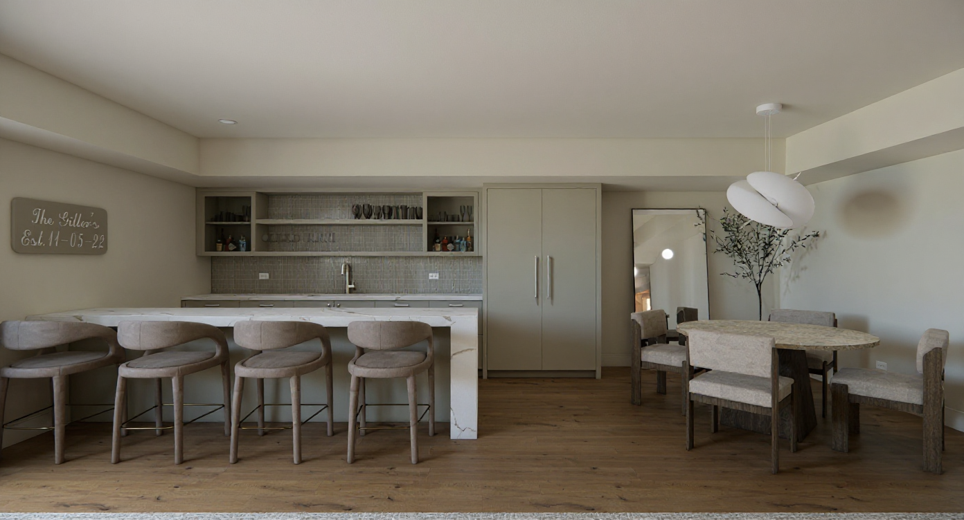 sol carrelage gr s beige rose murs nude 3 suspensions en verre au dessus de l il t de gauche chaises de la table velours prune baie vitr e anthracite une personne assise la table