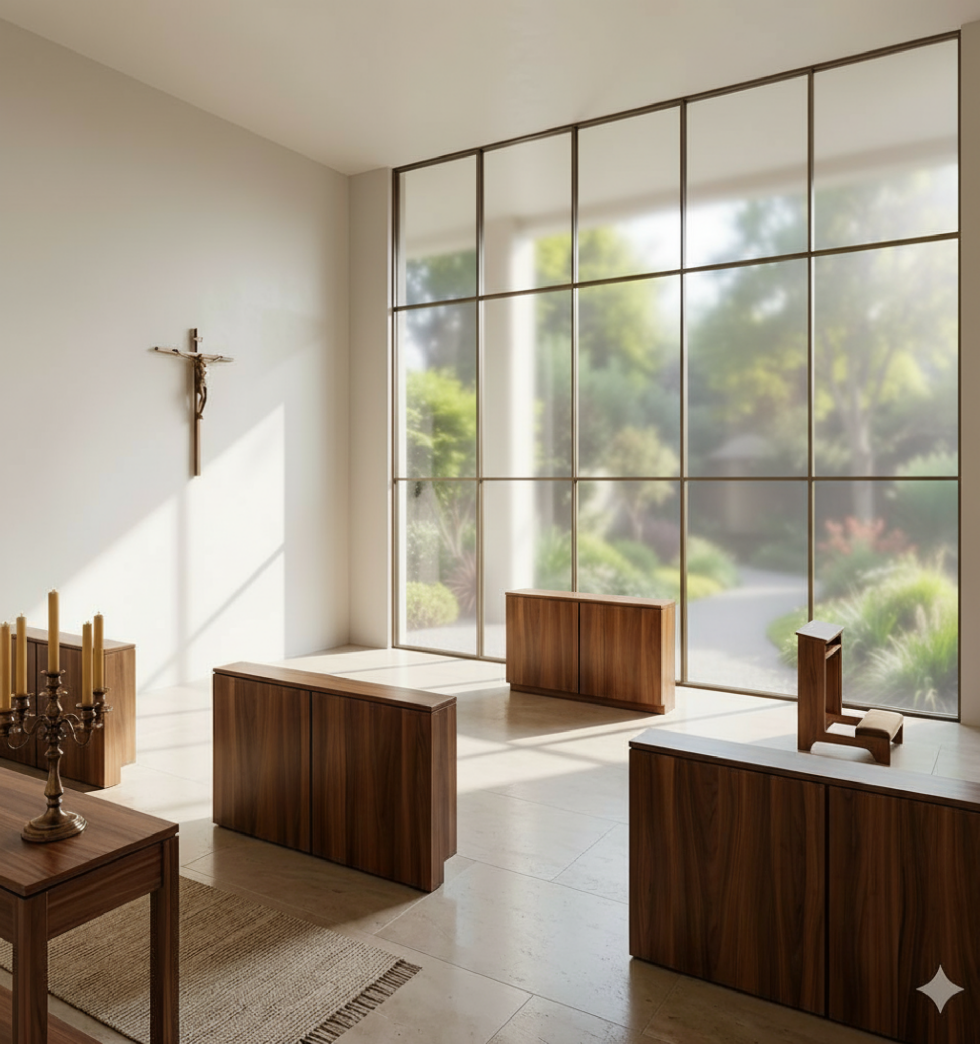 ultra realistic architectural interior render of a minimalist contemporary chapel maintaining the exact original composition camera angle furniture layout and lighting add a perimeter dropped ceiling plaf n perimetral with a subtle recessed design incorporating warm recessed spotlights evenly distributed to create soft indirect ambient lighting modify the main wall where the crucifix is located to be finished with an elegant beige textured wallpaper high end fabric like finish soft matte appearance adding warmth and sophistication without altering the simplicity of the space preserve all existing elements large floor to ceiling window with soft natural light wooden benches altar stone flooring and serene atmosphere lighting should be natural warm artificial 3000k enhancing a calm sacred contemplative mood highly photorealistic soft shadows global illumination ambient occlusion high detail materials no distortion no redesign of geometry