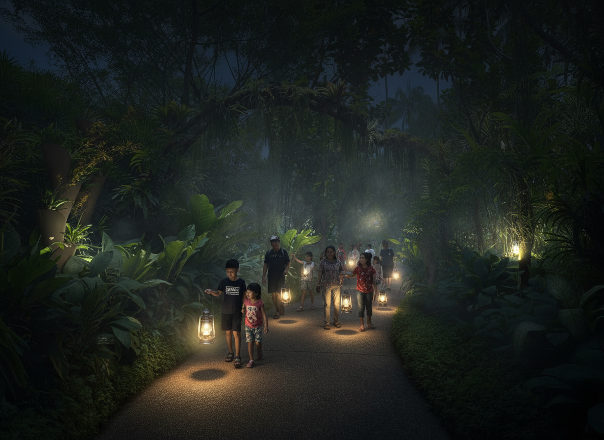 a render of a night installation at the singapore national orchid gardens the path is filled with groups of people made of families and couples they walk through the dark trail carrying oil lamp lanterns each lantern base shines light from the bottom illuminating the pathway in front of them in an bright arch along the pathway the orchids along the sides are dimly lit soft fog moves through the space in the distance more groups with lantern glows can be seen