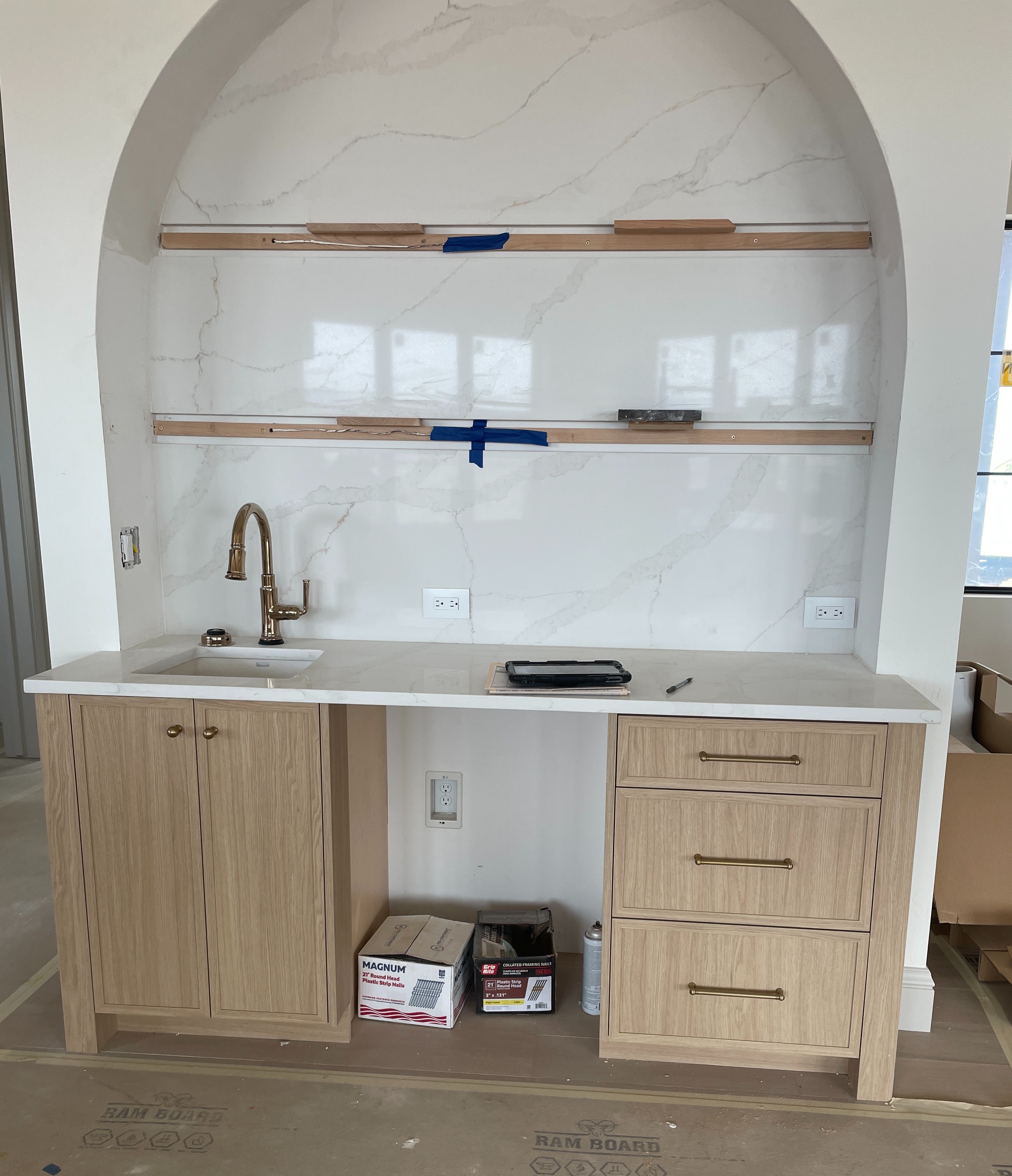 do not change the cabinets at all preserve the exact cabinet colors materials finishes door style drawer style hardware proportions reveals geometry and alignment exactly as shown do not alter the countertop flooring walls ceiling angles perspective lighting direction appliances or any architectural elements keep the camera viewpoint absolutely identical only remove clutter construction materials and unfinished areas clean the room and make it look fully finished add only minimal tasteful staging items appropriate for the space such as a small plant or a folded towel do not add any furniture or change anything about the cabinets countertop or room structure negative constraints no cabinet changes no perspective changes no angle changes no color changes no resizing no shape changes no geometry changes no filler changes no hardware changes no new cabinetry no wall changes no added shadows that distort structure add floating shelves in the arch to match stage for a wet bar add wood flooring