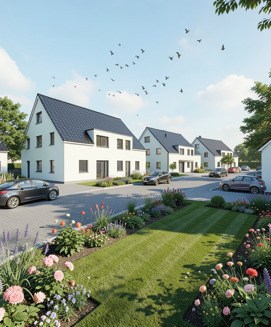 settlement street only some birds on sky sunshine day green garden mowed some flowers only some cars on street black roof tiles model creaton futura
