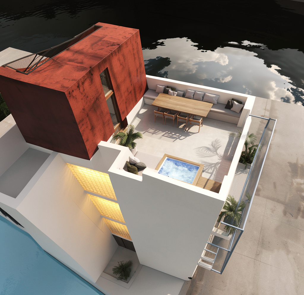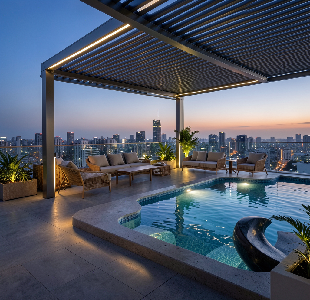dont change anything except pool and table with chairs in the terrace turn it into luxurious terrace featuring a modern sculpted pool modern metallic pergola with adjustable louvers stylish rattan lounge furniture ambient led strip lighting and warm sunset hour lighting 8k resolution realistic dont change angle other objects dont mess with geometry everything else the same