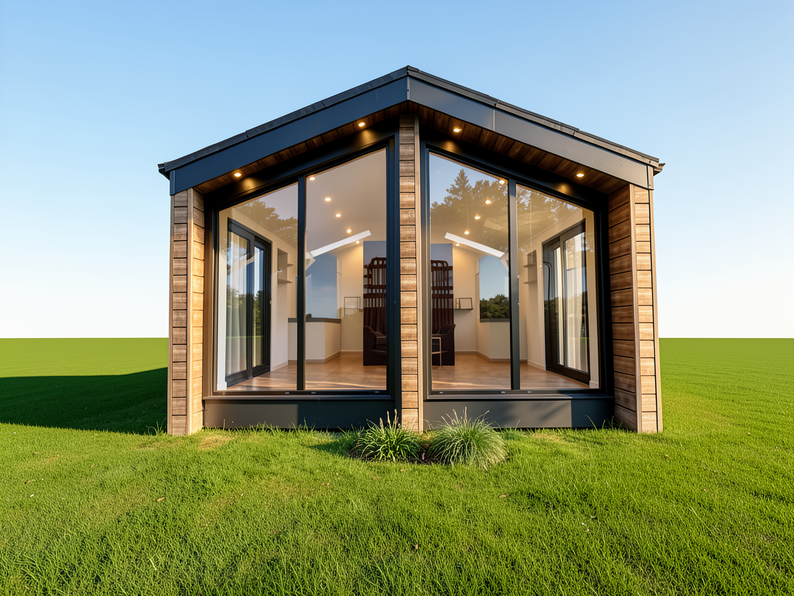 edit the uploaded house photo by changing only the surroundings remove all background elements such as buildings cars fences trees people and any other objects replace them with a calm minimal environment flat green grass and a clean clear sky keep the house completely unchanged do not modify the building shape proportions roof window and door layout or facade color do not enhance or stylize the house the house must remain exactly as in the original image match lighting perspective and shadows so the new environment blends naturally with the house realistic style high quality natural colors no artifacts
