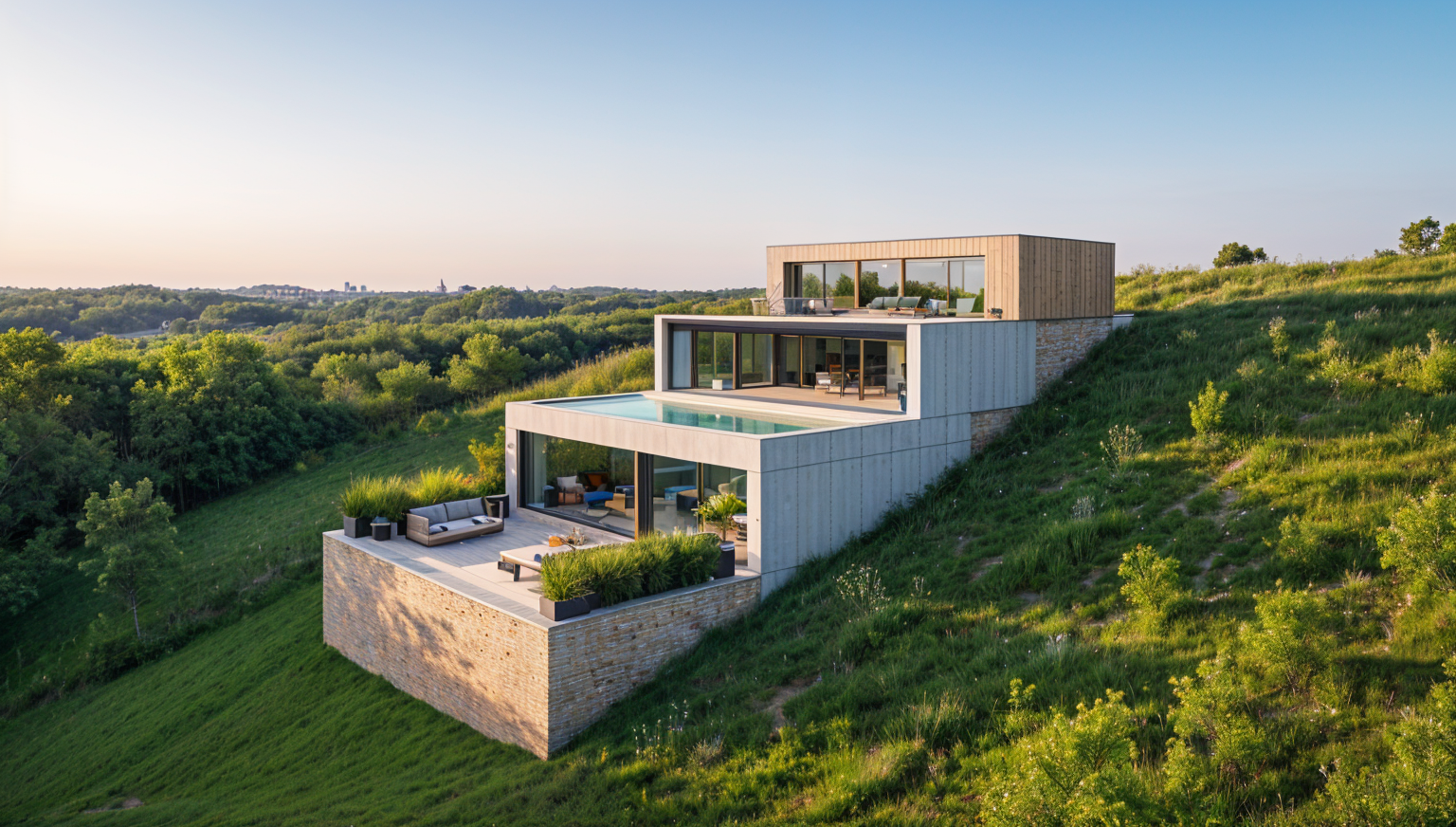sarineen exterior shot generate a building with three rectangular levels arranged as stepped terraces level 1 the largest rectangle this level contains the bedrooms level 2 same width as level 1 but shifted backward creating a front terrace this level contains the living room level 3 a smaller rectangle shifted further backward in the same direction on level 3 place a rectangular glass bottom pool positioned directly above the living room so the pool s glass floor is the ceiling of the living room maintain the stepped geometry and proportions exactly as described architecture