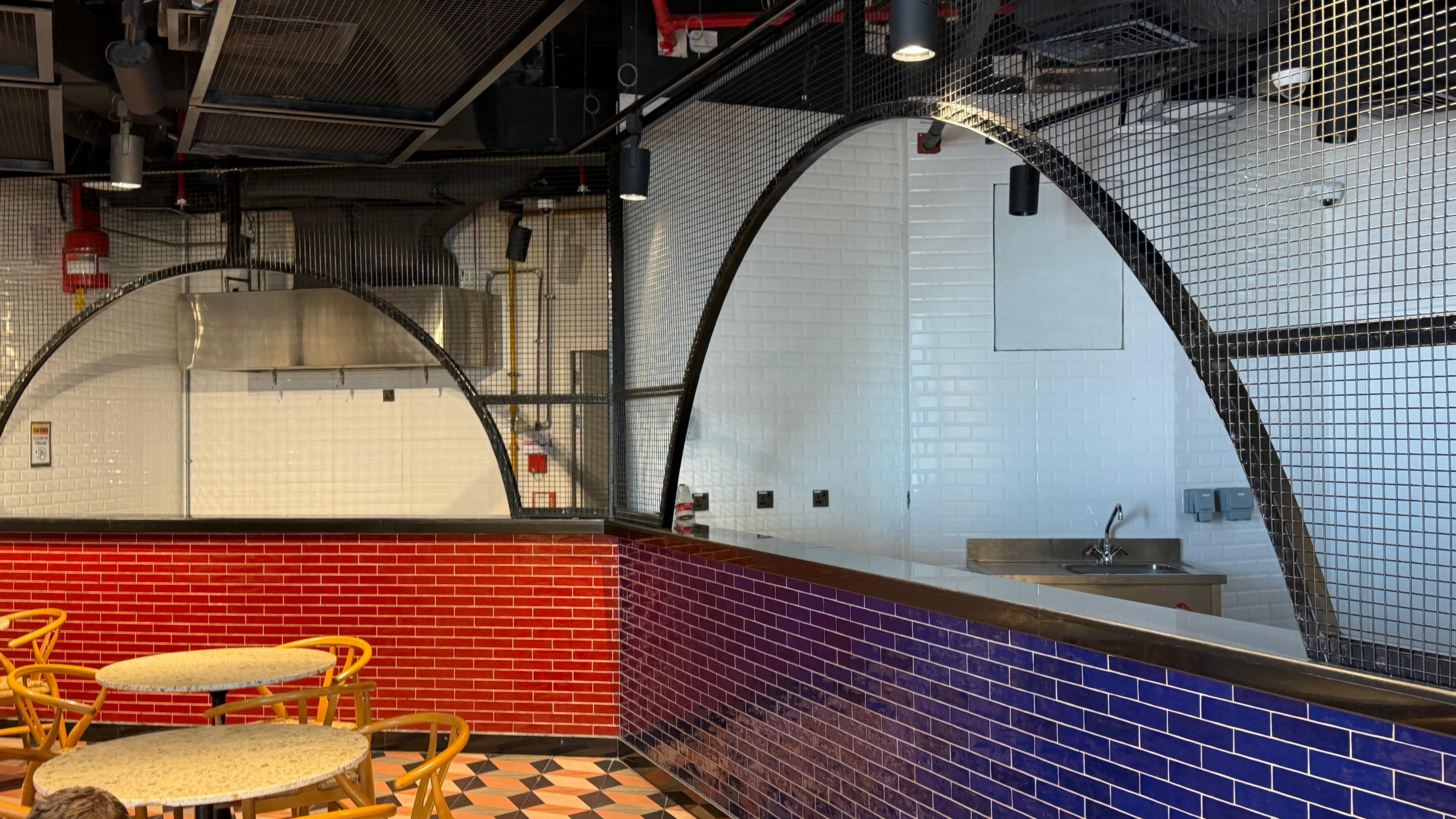 a small qatari street food restaurant modern heritage style red brick counter wall warm wooden accents traditional sadu patterns soft warm lighting arabic lanterns hanging compact seating with wooden and rattan chairs small round tables open kitchen concept cozy atmosphere maroon and beige color palette inspired by qatar flag minimal but authentic decor clean and stylish instagrammable corner realistic ultra detailed