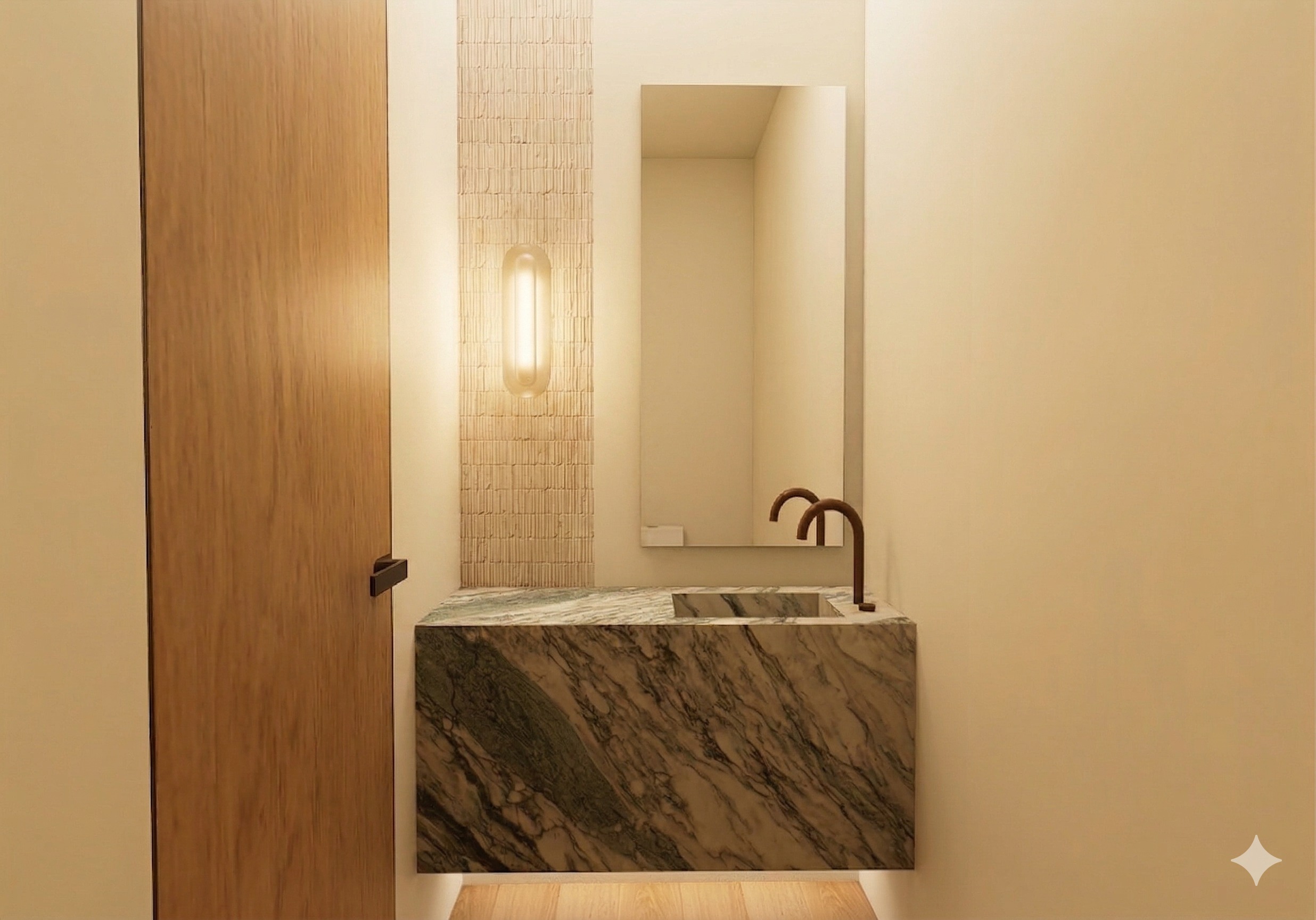 photorealistic interior render of a narrow modern powder room maintain exact geometry layout proportions and all existing materials from the model with no alterations or additions walls finished in warm creamy off white roman clay plaster with subtle texture feature wall behind vanity clad in vertically stacked small format textured tile in a light neutral tone floating monolithic stone vanity in heavily veined marble with dramatic diagonal veining integrated rectangular sink wall mounted faucet in dark aged bronze finish centered over sink tall narrow frameless borderless mirror mounted above vanity vertically aligned minimal wood door with flat panel and dark hardware on left side light natural wood flooring with soft matte finish lighting is soft warm and moody powder room ambiance hidden recessed ceiling lighting not visible plus a single vertical wall sconce centered on tile feature wall emitting diffused warm glow 2700k no additional light fixtures emphasize soft shadows indirect lighting and realistic light falloff no overexposure no harsh highlights camera positioned at human eye level 5 ft straight on view centered on vanity tight space perspective with slight wide angle lens approx 24 28mm equivalent without distortion materials must appear highly realistic with correct scale micro texture and subtle imperfections no added decor no styling objects no extra fixtures no changes to design style high end architectural digest minimalist warm refined moody