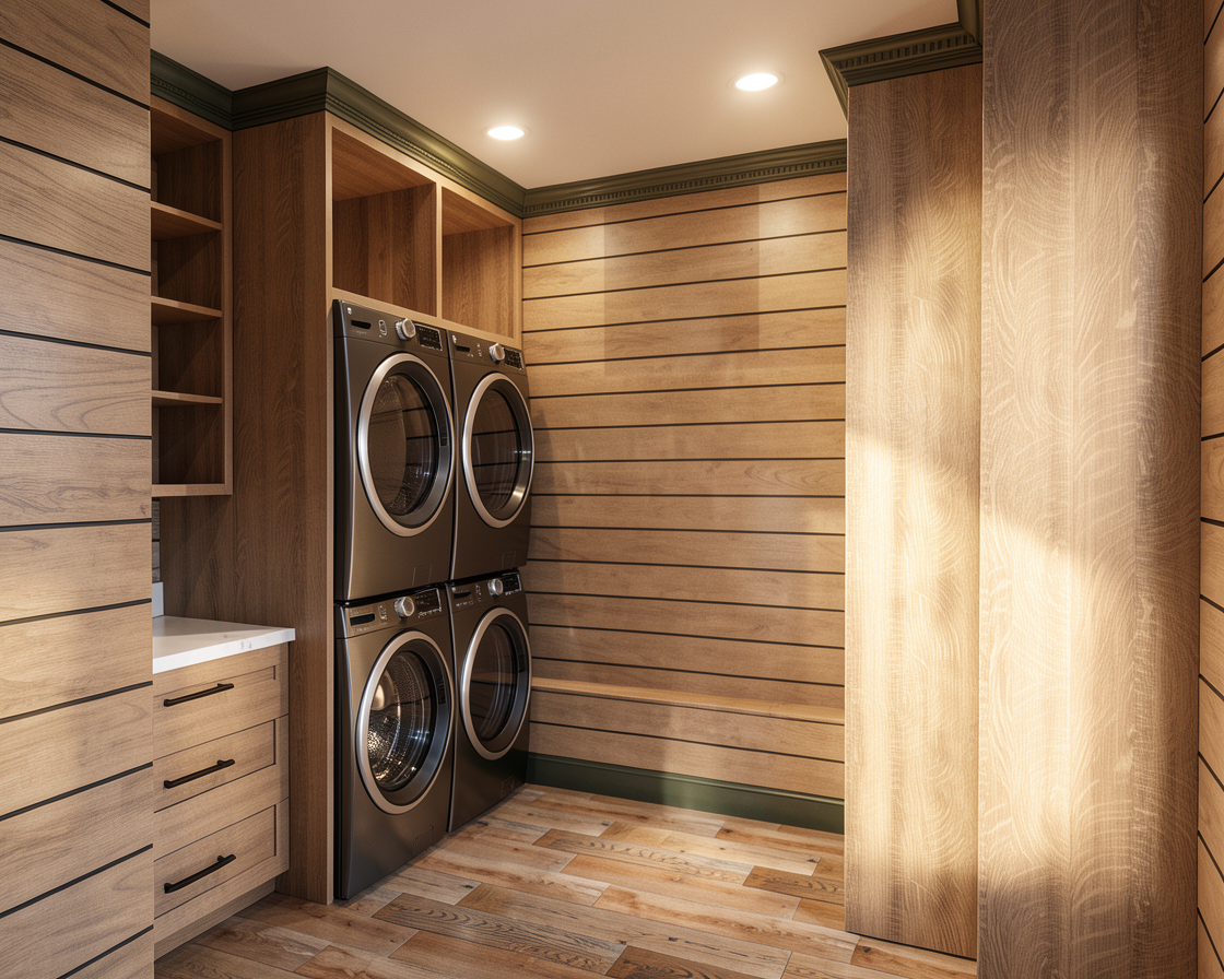 create a modern stylish cafe interior with a central bar use rich warm brown tones for the counter and mesh ceiling complemented by a light woorden countertop the stools should have black metal frames with brown leather seats emphasize soft lighting with hanging bulbs for a cozy atmosphere incorporate a sleek coffee machine on the counter the staircase should be in a deep brown wood leading to a minimalist lounge area with subtle beige sofas the walls are a light wood texture and the floor is a soft gray cement exuding a welcoming contemporary feel