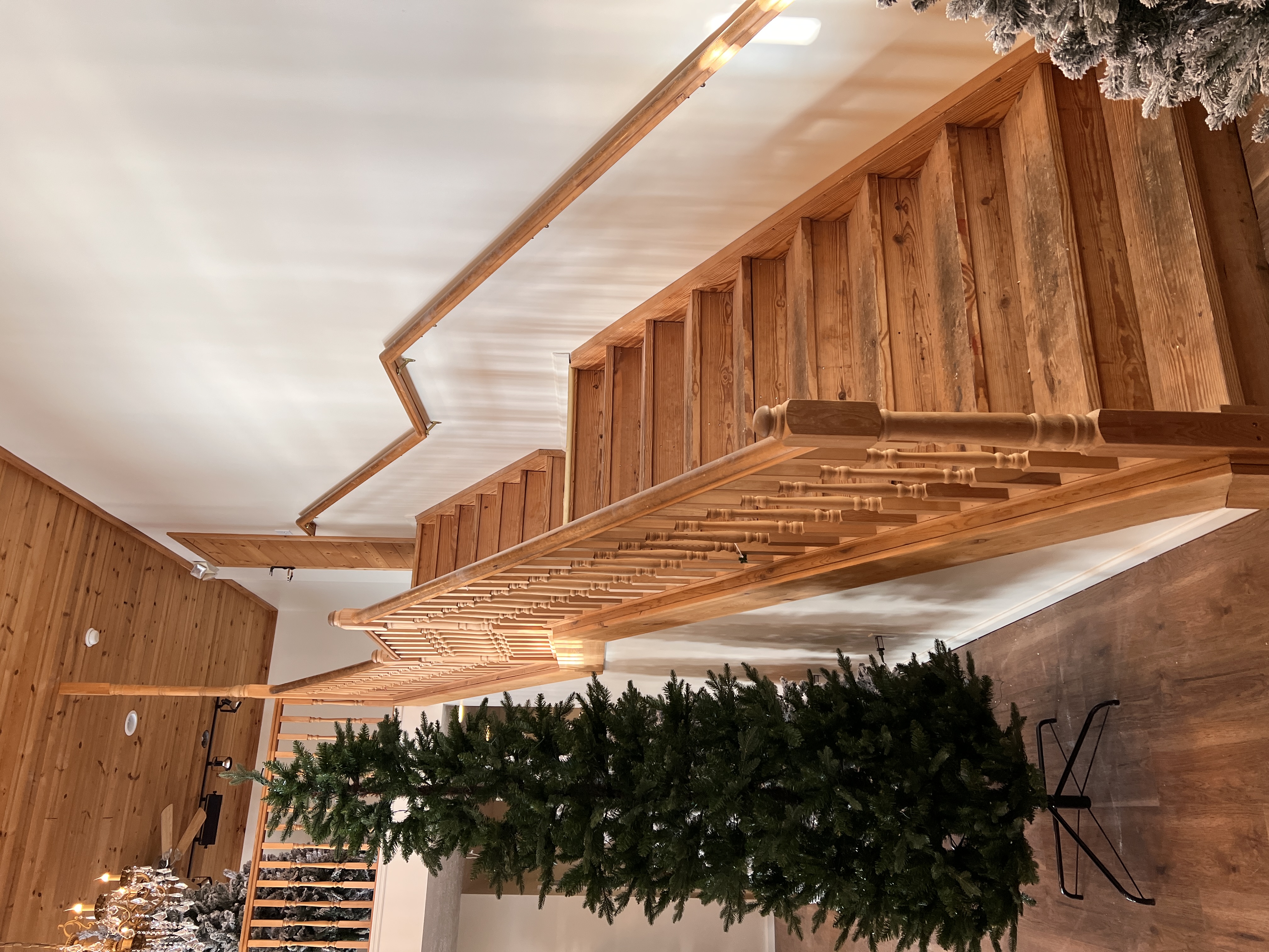 can you paint the walls a rich navy blue and decorate the handrailling for christmas with garland and bells and decorate the christmas tree to be large and full