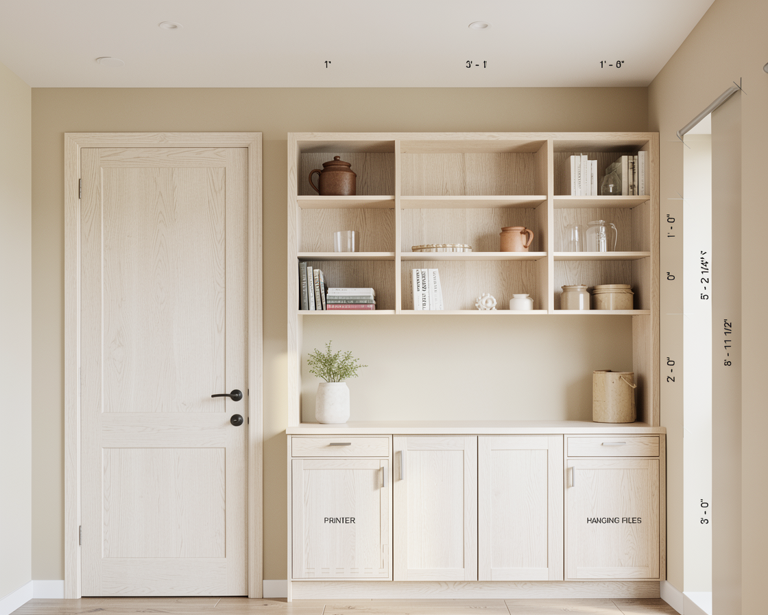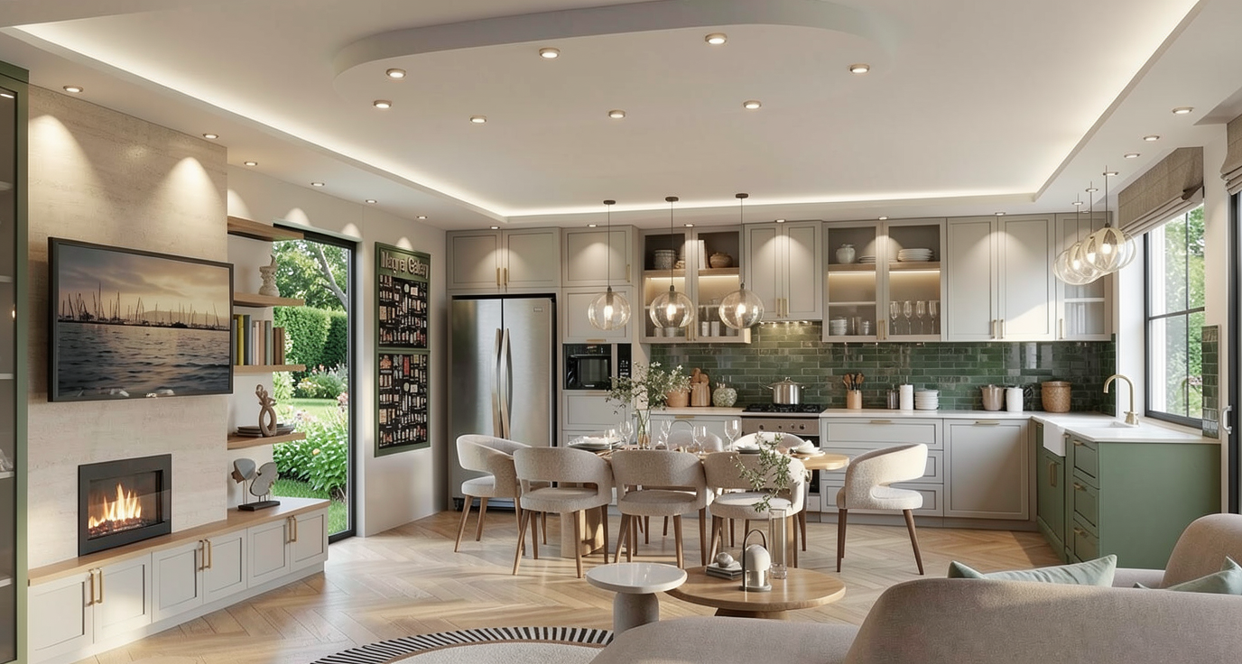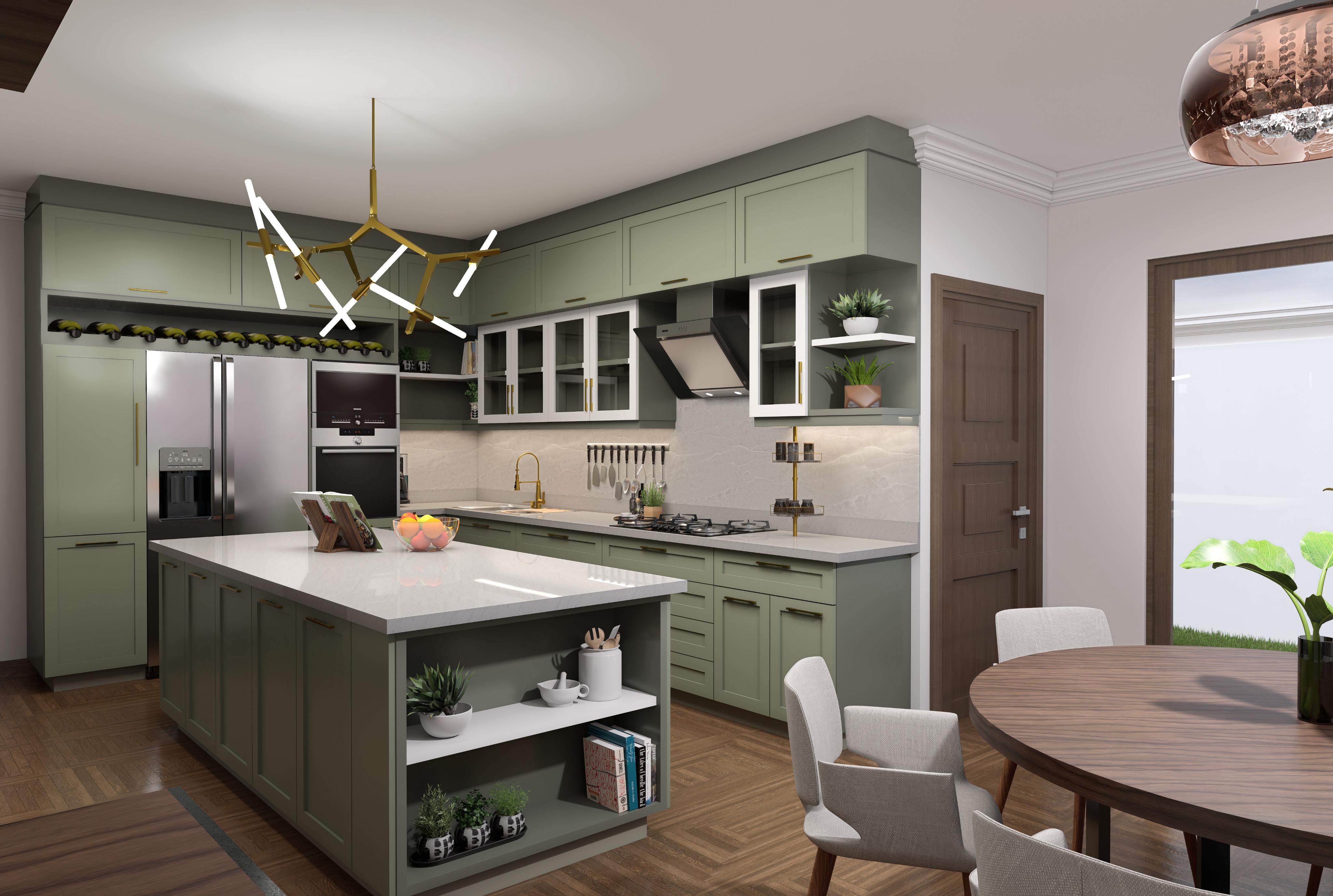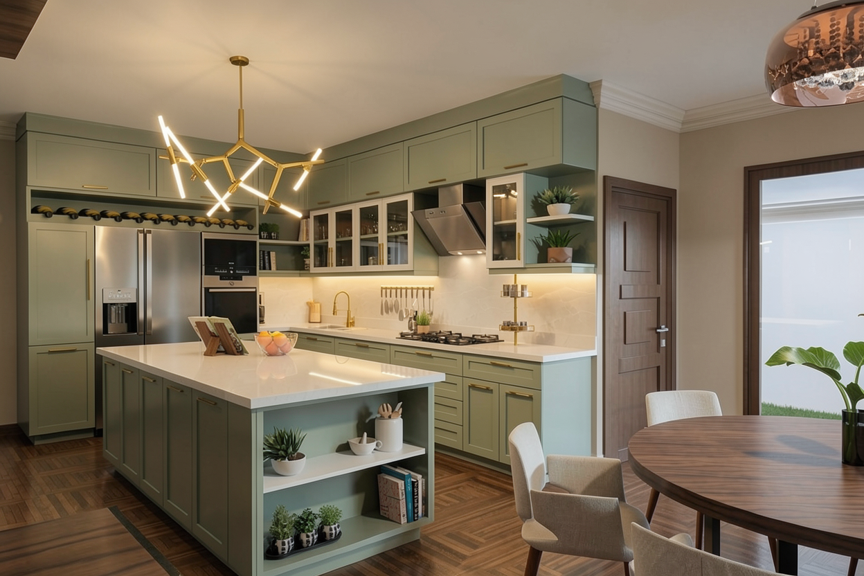 high end modern kitchen interior sage green shaker cabinets white quartz countertops golden hardware large kitchen island with open shelving contemporary gold branch chandelier herringbone walnut wood floor neutral walls with crown molding realistic lighting cinematic composition architectural photography style