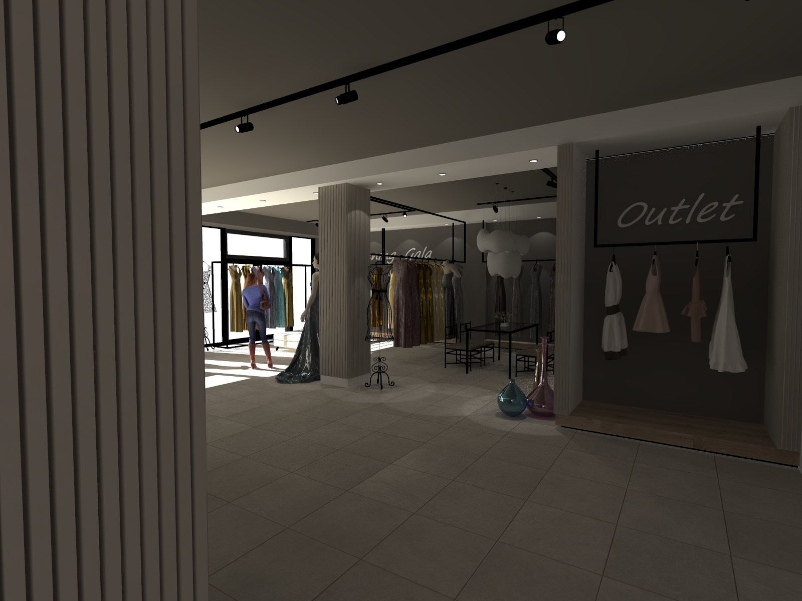 mantain colours and textures add a soft warm light underneath the wooden platform add dresses on the hangers