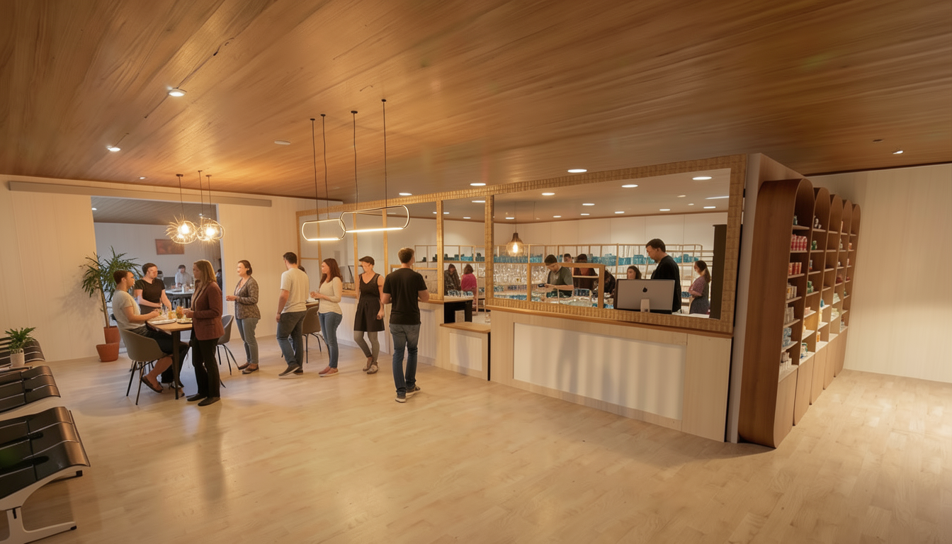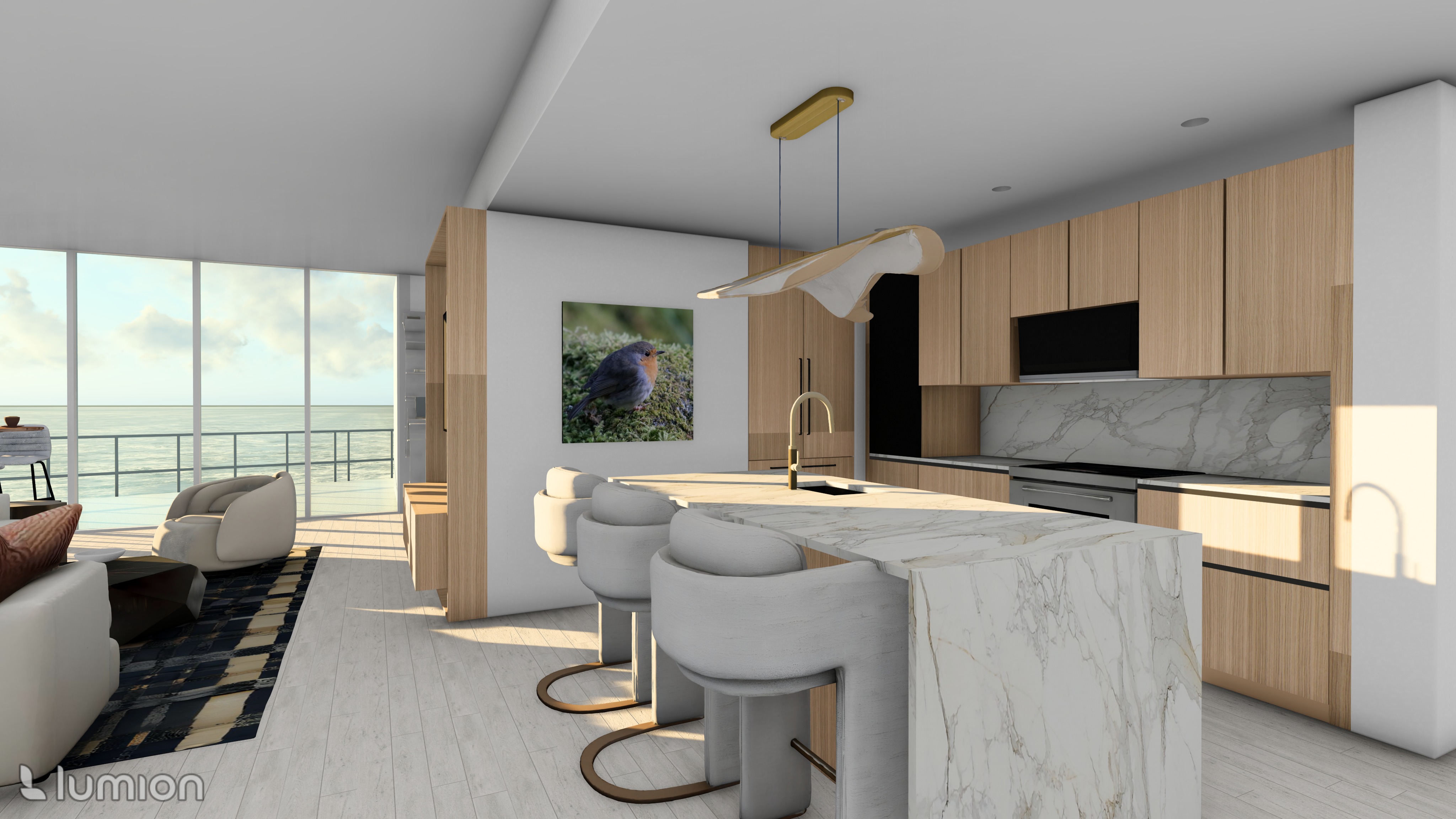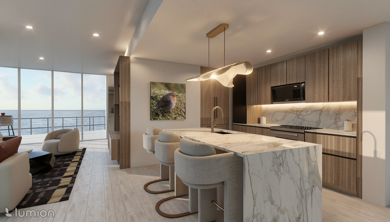 add more texture to this realistic render and add more depth to it add downlights in the ceiling where there is three gaps in front of the main kitchen unit only and some lighting atmosphere add lighting atmosphere from the pendant above the kitchen island fix the wood texture where it looks a bit off do not any downlights in the living room space
