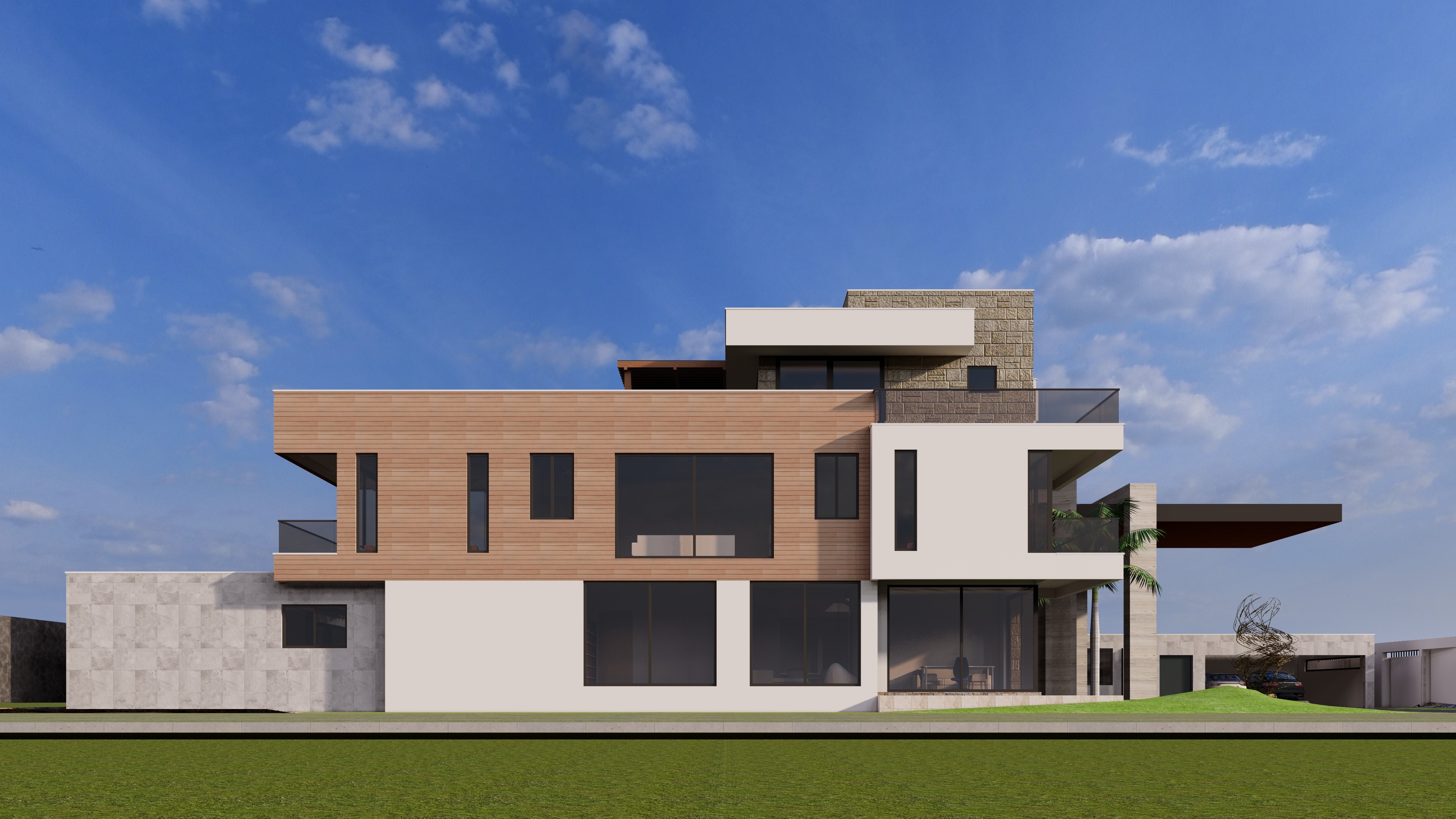 image of modern maisonette add few trees in far background for context add vegetation including floral ones for context as well make scene look lived in there should not be any haziness or excess strength from the sun light or sun rays