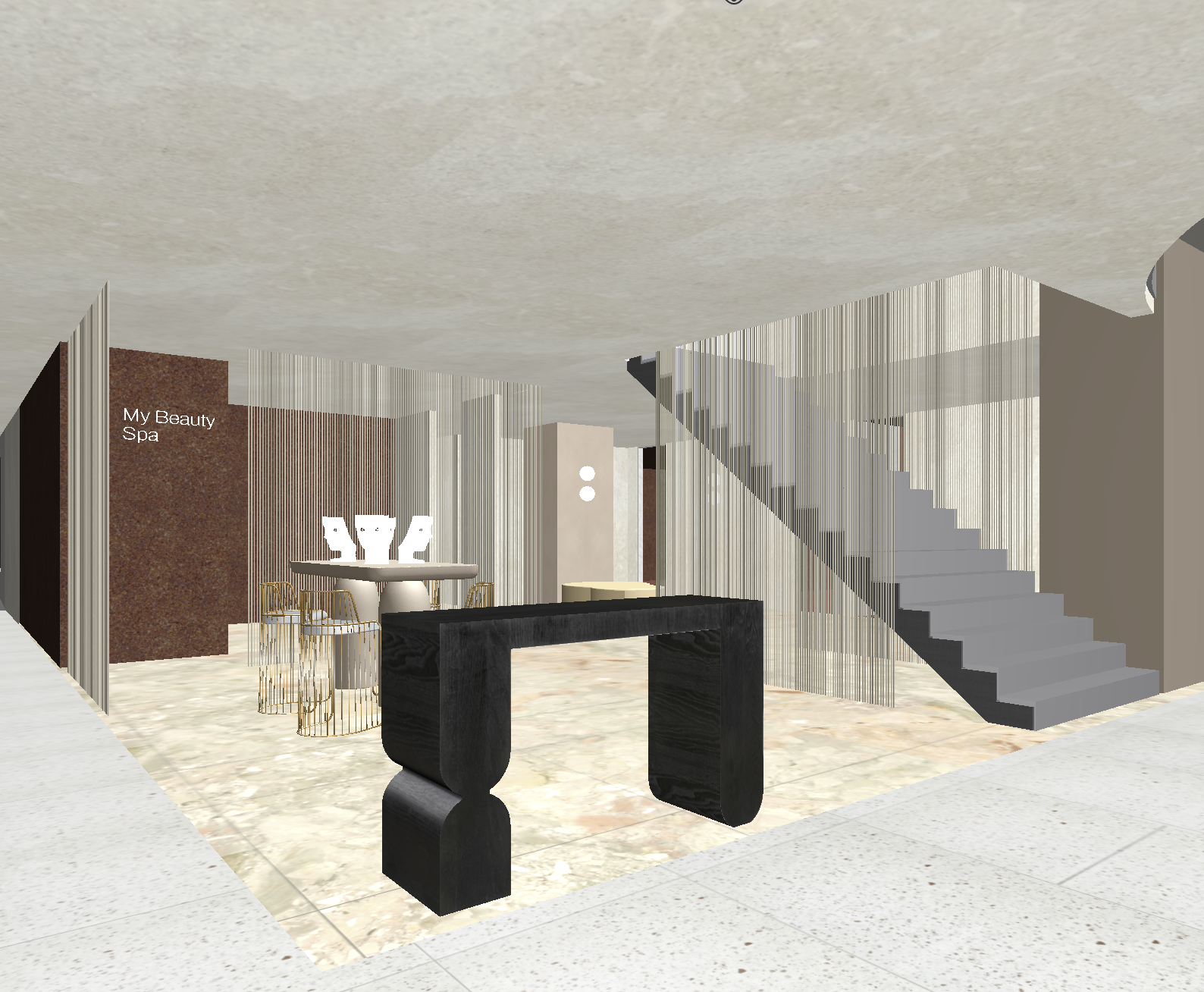 warm day spa tones soft shadows low light inside a mall show the vertical line features as a semi transparent fluted glass finish show a warm glow inside each consult room show the stairs in a dark blue stone finish