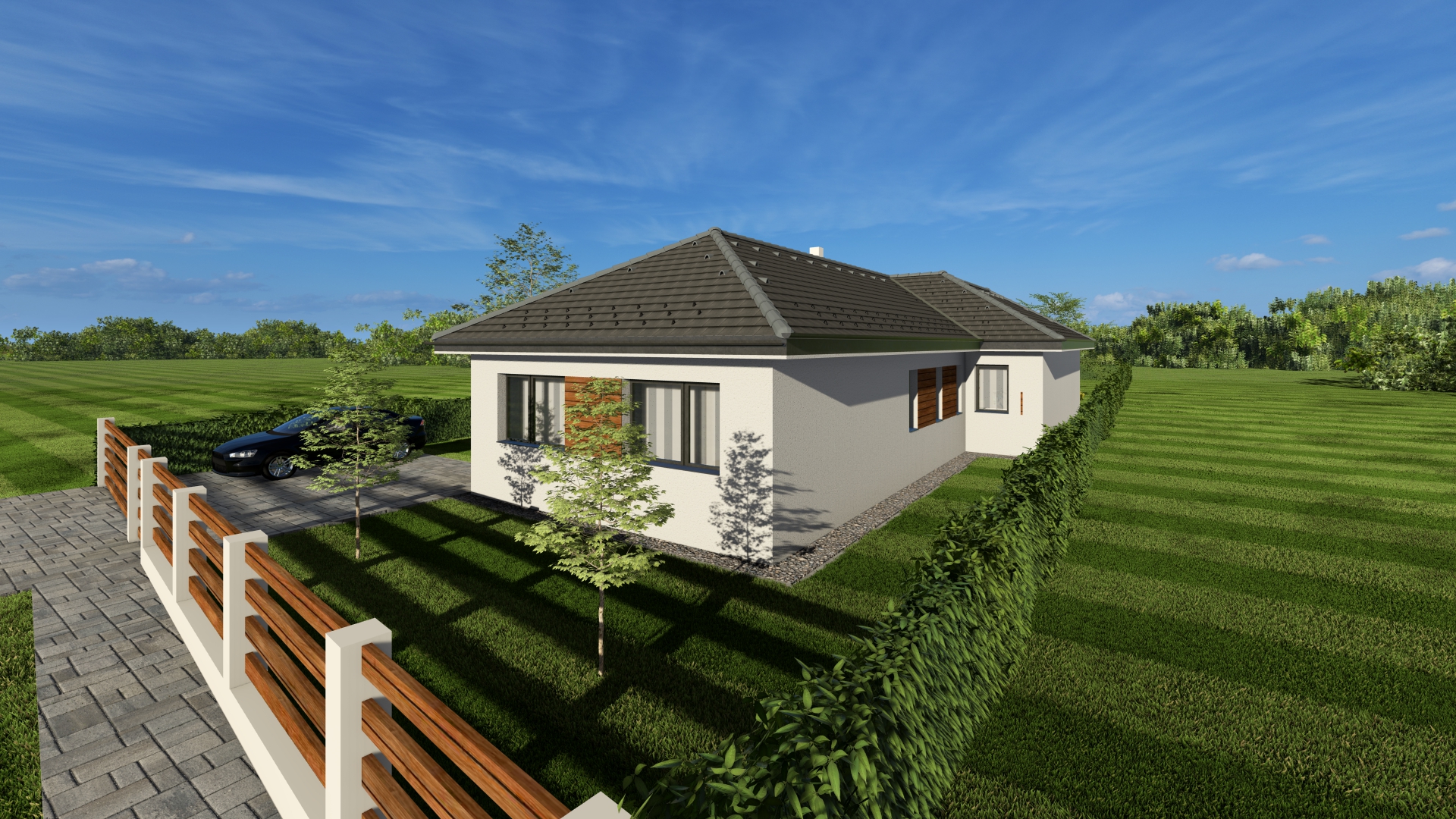 render a photorealistic 3d perspective of this house in a hungary do not change the view keep model geometry the same windows doors roof walls pavement driveway fences facade decor sidewalk hyper realistic 8k cinematic lighting serene atmosphere photorealistic textures realistic reflections reference the current material style just enhance them only enhance the current materials and make the landscape nicer vegetation detailed textures in the wood siding and glass reflections and a vibrant clear sky with light atmospheric depth render in hyper realistic architectural visualization quality 8k resolution roof minimalist anthracite concrete tile facade a mix of smooth white mineral plaster horizontal walnut wood slats windows antracit aluminium minimal fence anthracite colored premium metal mesh landscape professional minimalist garden design green clean cut grass 2 young maple tree prunus laurocerasus whether nice clear early summer in middle europe outside the fence some new family houses natural hungarian great plain native landscape do not add more fence or railing do not change fence keep the original fence keep the wooden facade decor and do not add more not change the composition