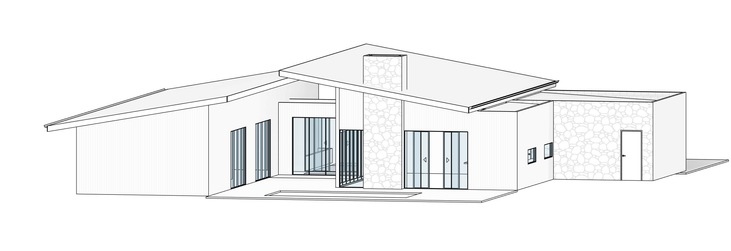 shou sugi ban cladding black to the house and stone cladding to the garage on the left and stone cladding on the boundary walls infront add more landscaping to the front and swimming pool infront of the stone cladding