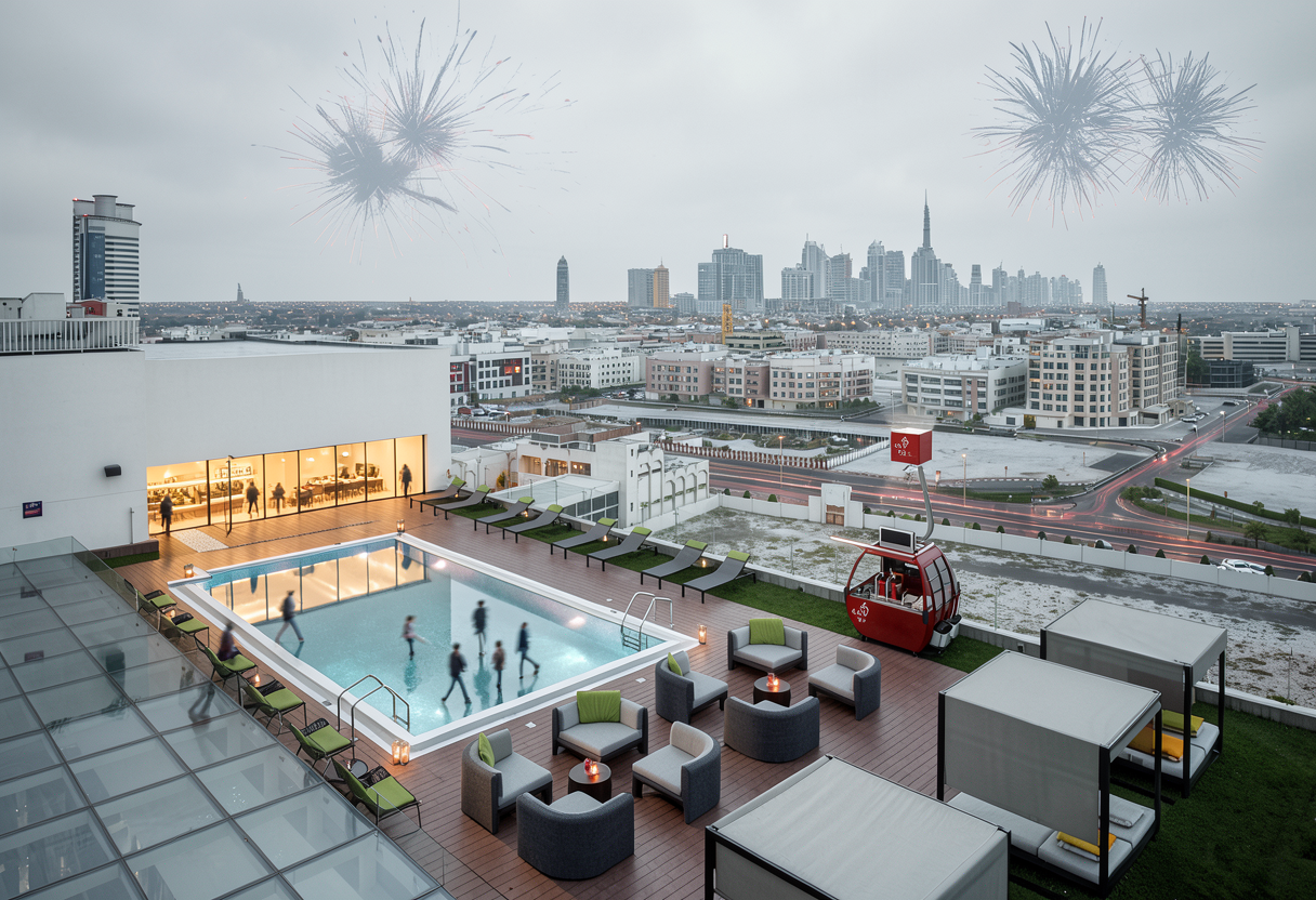 important preserve the existing geometry and the existing context exactly as provided preserve the existing windows do not add new windows do not modify alter reinterpret add remove scale or reshape any geometry do not change the site surroundings street layout neighboring buildings vegetation or context elements do not modify geometry scale proportions buildings road layout sidewalks or surrounding context in any way do not modify text soft overcast sky night atmosphere cinematic architectural mood warm interior lighting 3000k glowing from inside creating strong contrast between cool exterior and warm interior large glass surfaces with realistic reflections soft mirror effect environmental reflections of sky and surroundings important do not add new windows