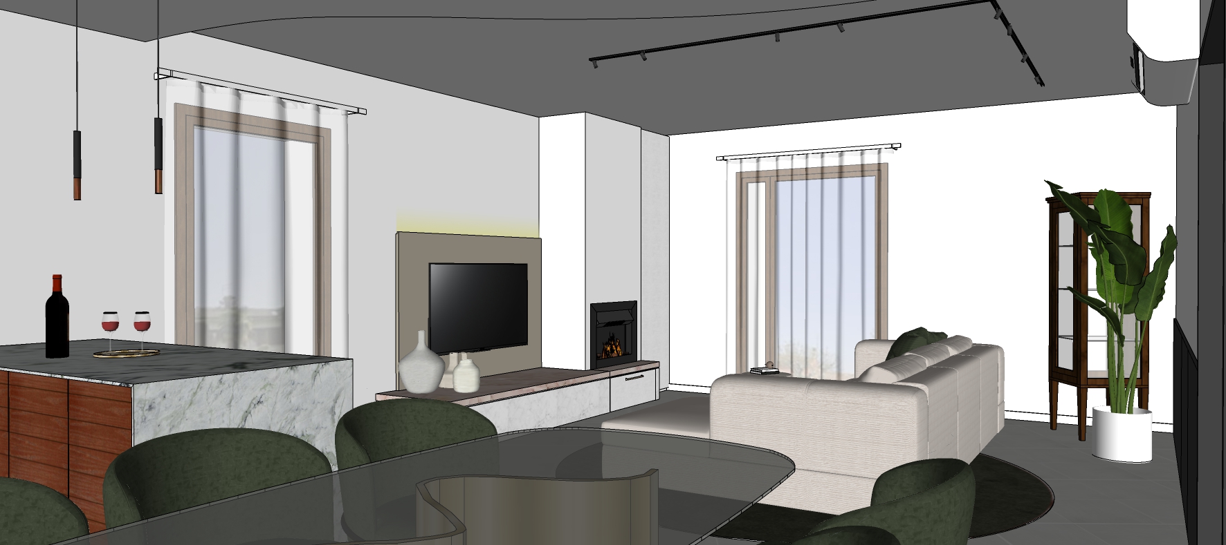 pavimento con ceramica 45x45 bianca lucida tappeto verde bosco binario tende bianco dietro al camino c un armadio a tutta altezza rispetta tutti i parametri della foto