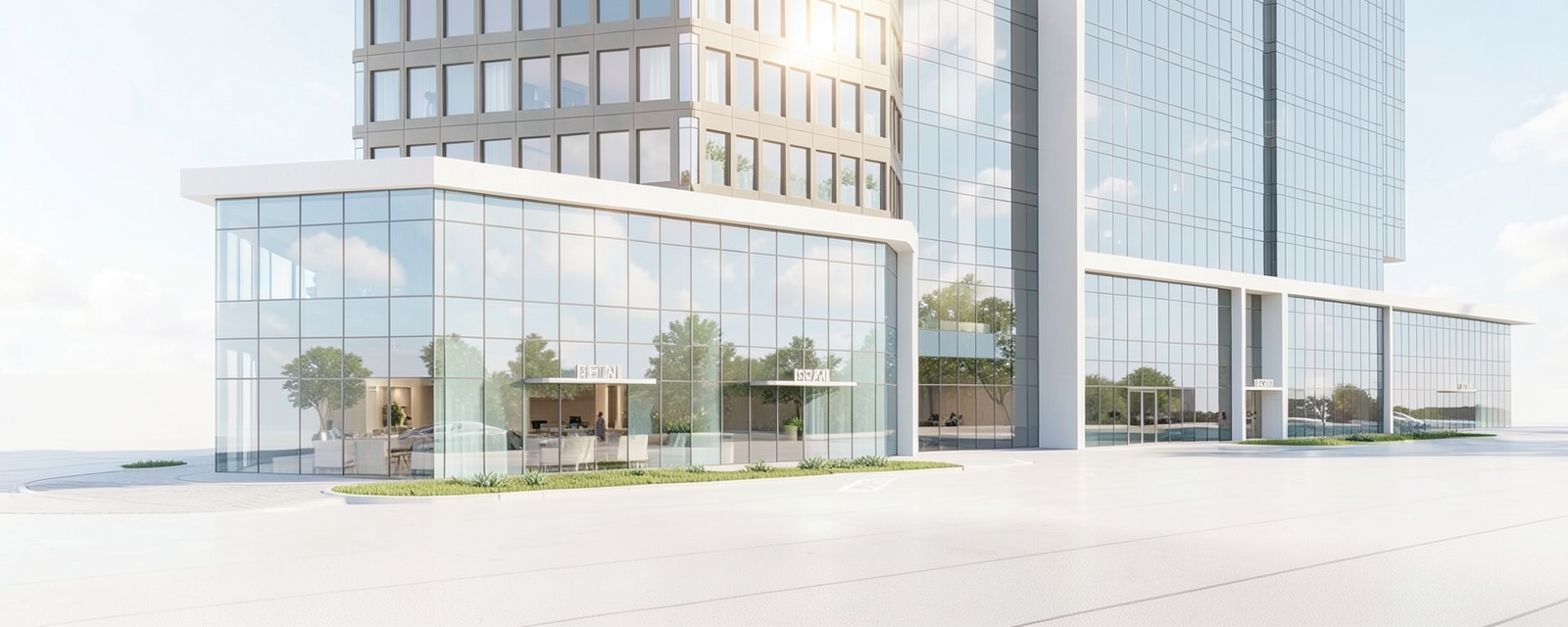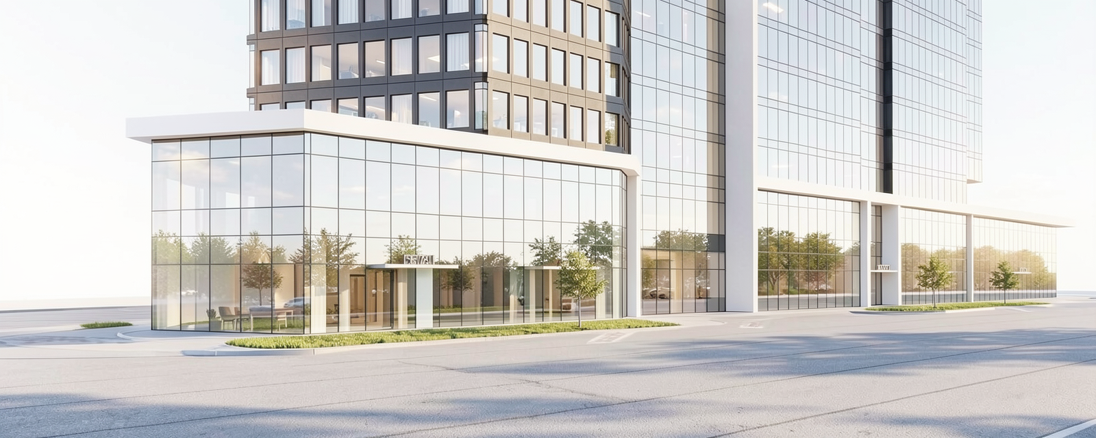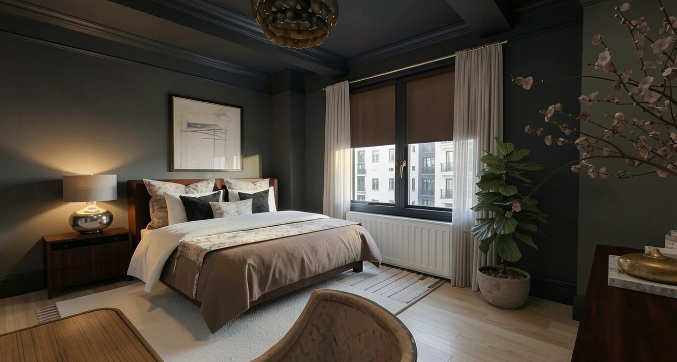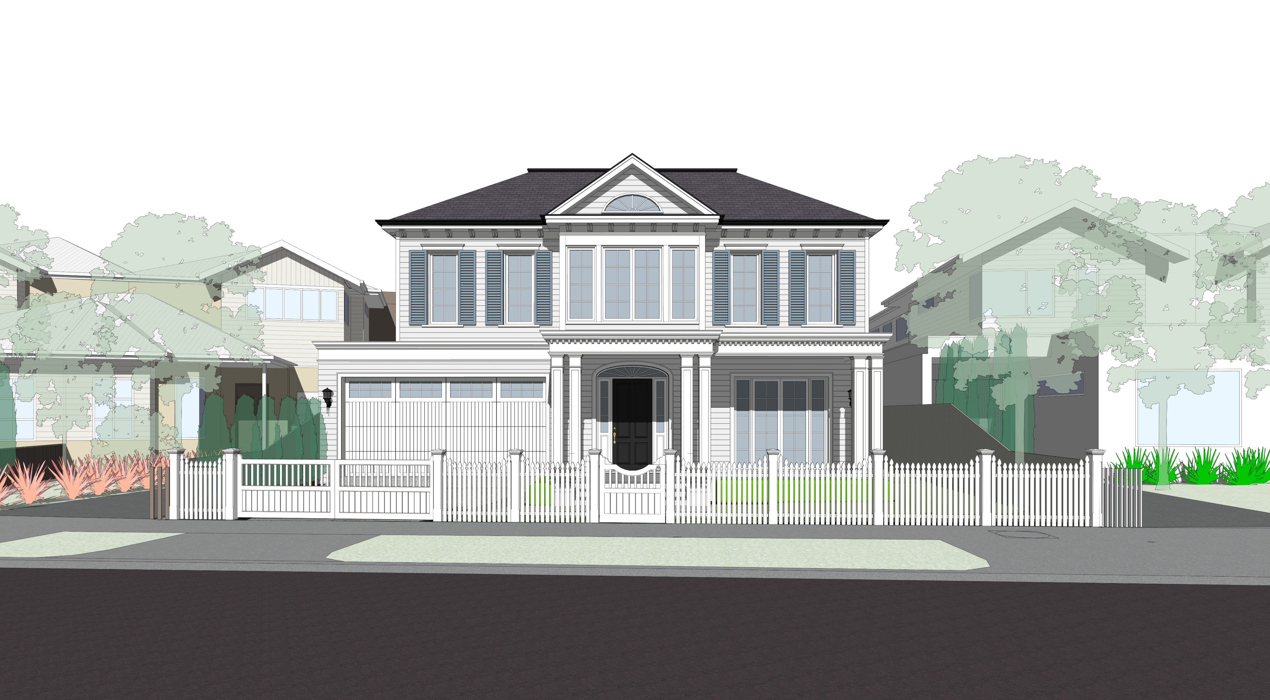 white themed home with white picket fence ground floor flat roof black slate tile roof garage door on the left side facing the street wet road photorealistic render sunny day raytracing lawn nature strip